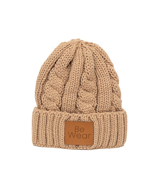 Pletená čepice s copánkovým vzorem a koženým detailem. Cena 495 Kč