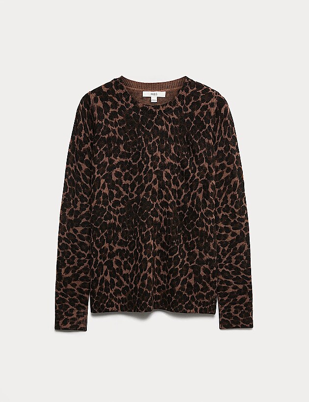 Svetr s elegantním kulatým výstřihem zdobí výrazný zvířecí potisk, který stylově ladí s žebrovanými detaily a vytváří moderní a elegantní vzhled. Cena 1800 Kč