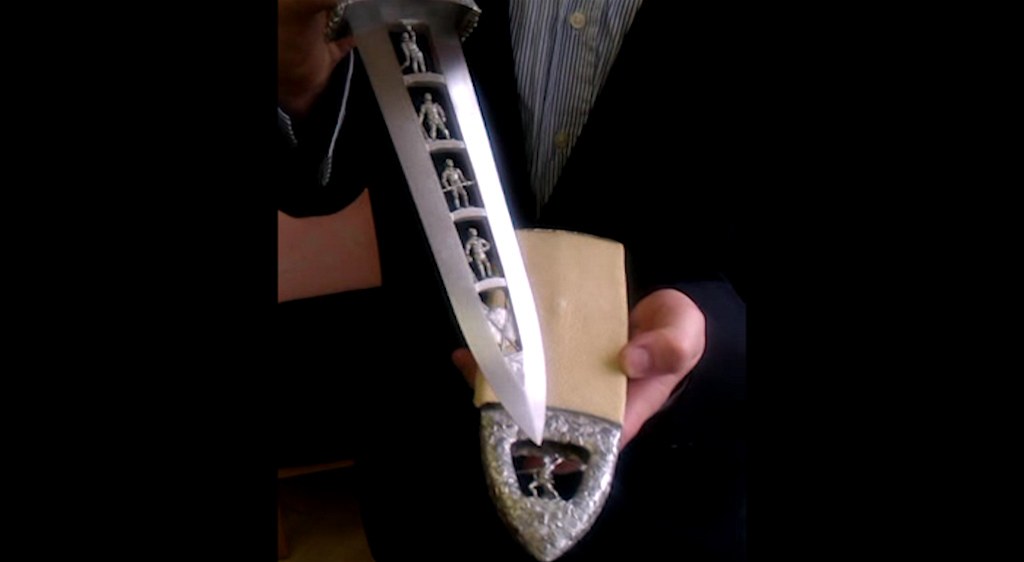 Na rukojeti je znázorněný souboj gladiátora s medvědem. Nůž však ještě není hotový ani po roce práce, kterou mu rytec věnoval. "Ještě na tom budu muset možná až rok pracovat," dodal.