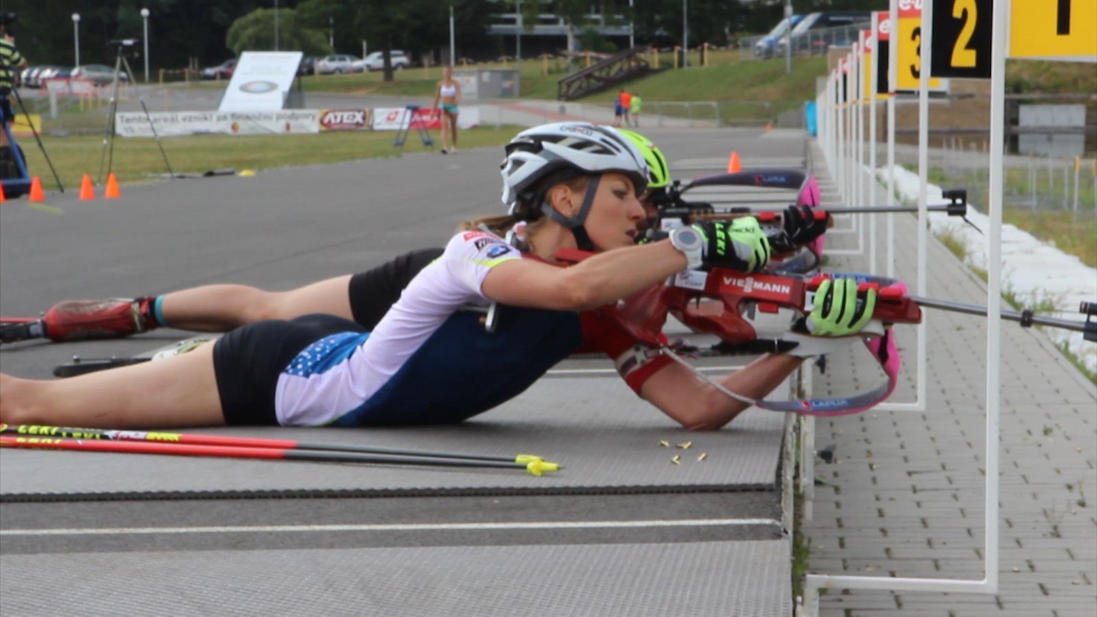 I podvečerní trénink ve sluncem rozpálené aréně měl do odpočinkového režimu hodně daleko. Spousta střelby a kilometry na kolečkových lyžích. „Během jednoho tréninku holky vystřílí takových 120 až 150 nábojů,“ počítal asistent trenéra Jiří Holubec, když biatlonistkám páskoval zásobníky. „Za rok to může dělat klidně patnáct tisíc nábojů.“