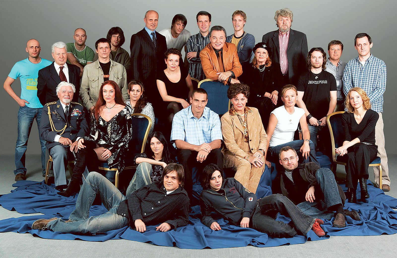 OSOBNOSTI ROKU 2004. V horní řadě zleva (stojící): František Táborský, Petr Vopěnka, Karel Heřman, Michal Malátný, Ondřej Škoch, Michal Horáček, Petra Buzková, Pavel Grohman, Petr Kužvart, Karel Gott, Štěpán Škoch, Jana Brejchová, Miroslav Ondříček, Richard Krajčo, Petr Klíma, Michal Kubal. V prostřední řadě zleva (sedící): František Fajtl, Blanka Matragi, Lenka Hyková, Roman Šebrle, Ája Vrzáňová, Lenka Šmídová a Irena Obermannová. Ve spodní řadě: Iva Frühlingová, Jiří Mádl, Aneta Langerová a Jan Hřebejk