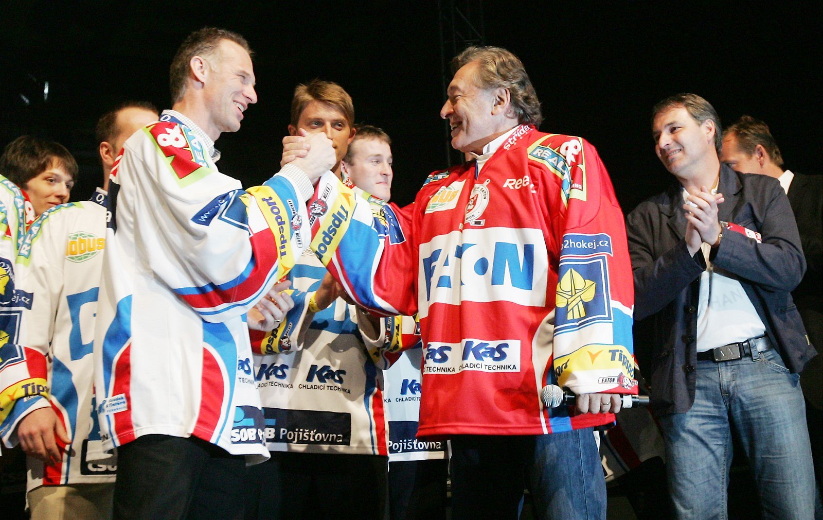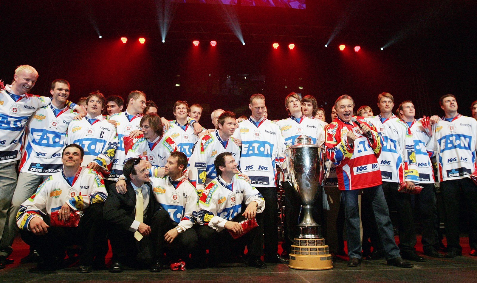 Zpěvák Karel Gott při oslavách mistrovského titulu pardubických hokejistů (25. dubna 2010)