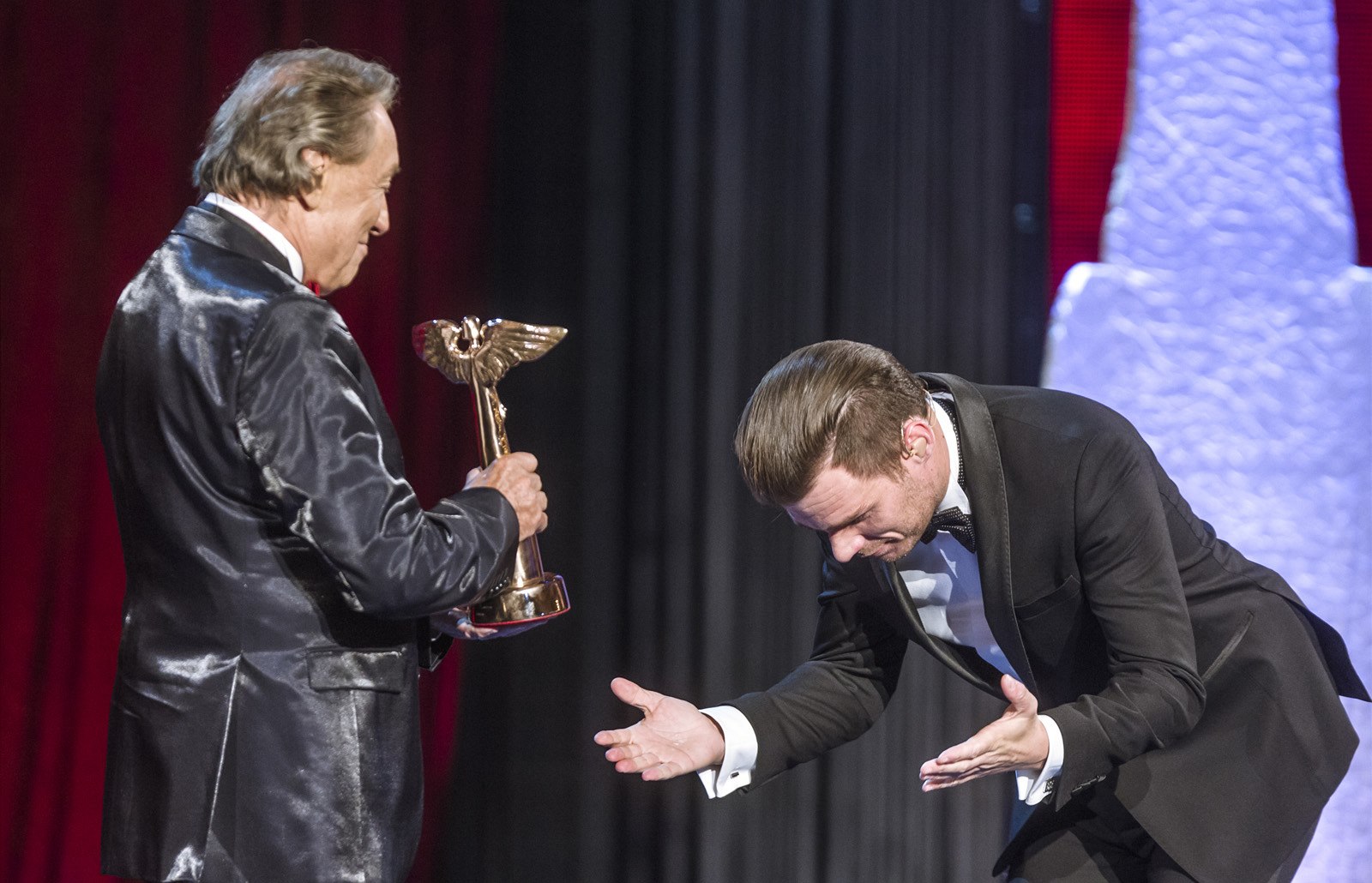 Moderátor Leoš Mareš předává Karlu Gottovi cenu Anděl při slavnostním večeru v Hudebním divadle Karlín. (16. dubna 2015)