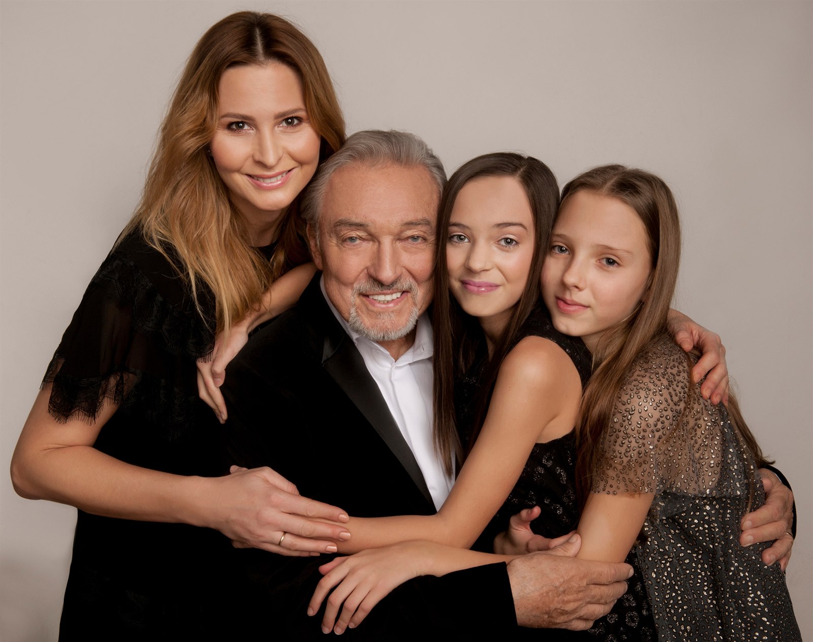 Karel Gott s ženou Ivanou a dcerami, devítiletou Charlotte Ellou v růžových a sedmiletou Nelly Sofií ve žlutých šatech.