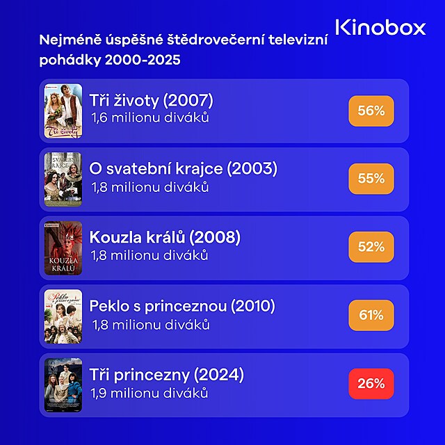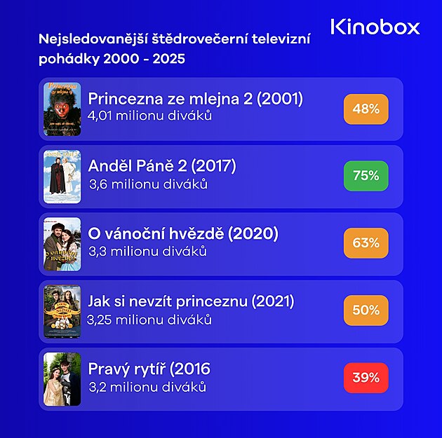 Štědrovečerní pohádky bývají pro televizní diváky vrcholem roku. V televizi se ostatně objeví něco, u čeho se sejde celá rodina, co zajišťuje hlavní program dětem a poskytuje novou podívanou dospělým. Pro Českou televizi je přitom rozhodující právě počet domácností, které pohádka v hlavním vysílacím čase Štědrého dne přiměje zapnout televizi a jak velký pocit spokojenosti v nich tím probudí. Ostatně se můžeme podívat, jak velkou sledovanost podle dat České televize měly pohádky v tomto tisíciletí, tedy za posledních 25 let. Analýzu připravil pro iDNES.cz filmový portál Kinobox.