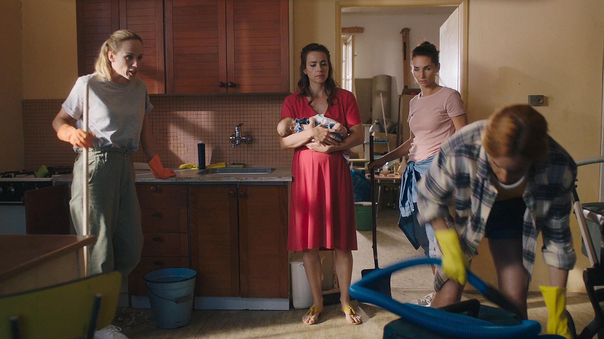 Hvězdička sociálních sítí, která příběh (zbytečně) komentuje, vysílá živě i vlastní porod a trpí, když jí partner koupí dům – pravda, zchátralý. Druhá je bohatá, ale osamělá, neboť muž stále pracuje, takže si zaflirtuje s aktivistickým kytaristou. Třetí, naopak chudá samoživitelka dvou dětí, neustále jejich otci odpouští nejen alimenty a čtvrtá, vzorná dceruška snobské matky, je mezi naivkami jejich královnou.