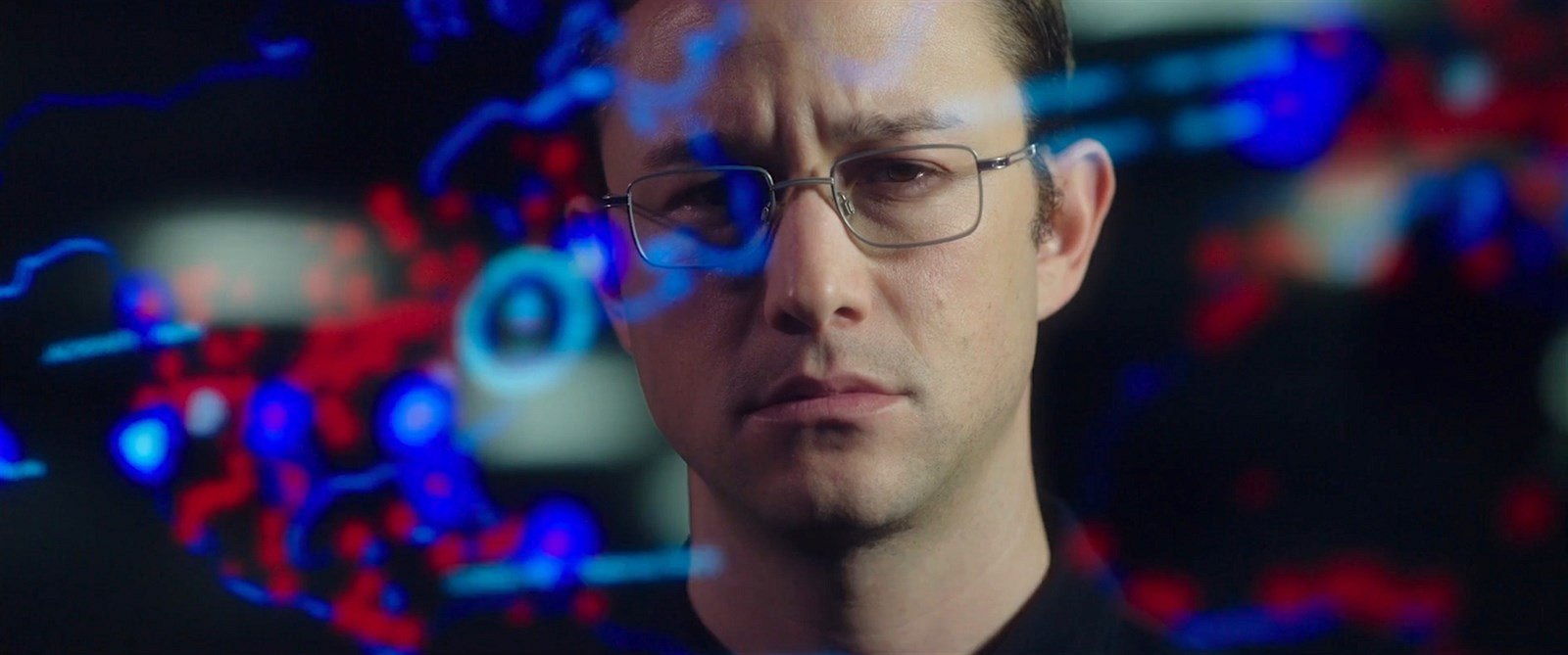 A jak jej vidí film? Jednoznačně hrdinsky až konfekčně včetně modelové stavby, která se od konspiračního setkání s novináři vrací v jeho zpovědi zpátky v čase. Tedy k armádnímu výcviku, kde od pohledu střízlík skončil se zlomenýma nohama. Věta „Své vlasti můžete sloužit i jinde“ jej dovede k CIA, kde tvrdí, že chce pomoci své zemi „zlepšit svět“, a dostane šanci, ač nedokončil ani střední školu a trpí epilepsií. Jeho novým bitevním polem se stává internet – film Snowdena beze stopy skromnosti líčí jako počítačového génia – a současně zažívá romanci s dívkou, která ho přesvědčuje, že „moje země má na rukou krev“. Podobně jej naleptává jeden z kolegů: „Jde jen o to, aby byl vojenský průmysl šťastný.“