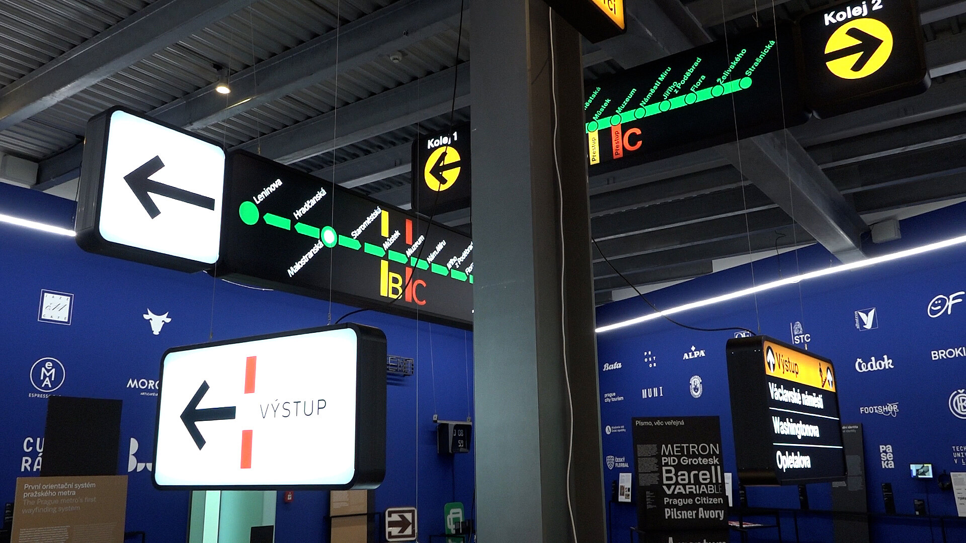 Prvky grafického designu ve městě často slouží k „suché navigaci“, jak poznamenala druhá kurátorka výstavy Linda Kudrnovská, a tím pádem musí být srozumitelné. Tato část expozice nabízí vývoj navigačních značek pražského metra a stěny pokrývají loga firem a institucí.