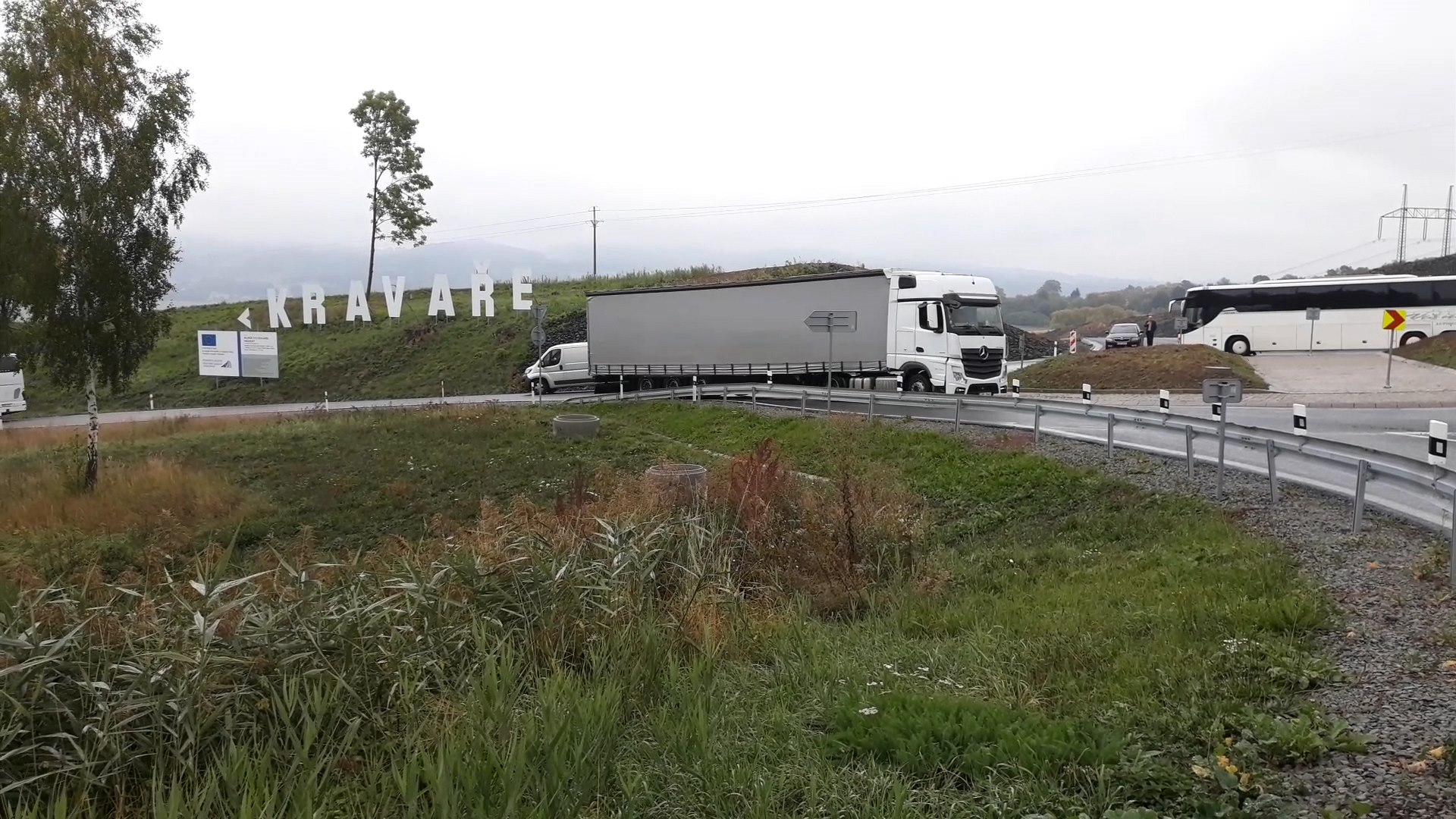 Současná silnice I/15 spojující Českolipsko s Litoměřicemi a dále Mostem teď vede středem obce. Obchvat o délce 2,6 kilometru mine Kravaře z jihu, obec se na něj napojuje dvěma kruhovými objezdy. Právě u jednoho z nich nechal starosta nápis postavit.