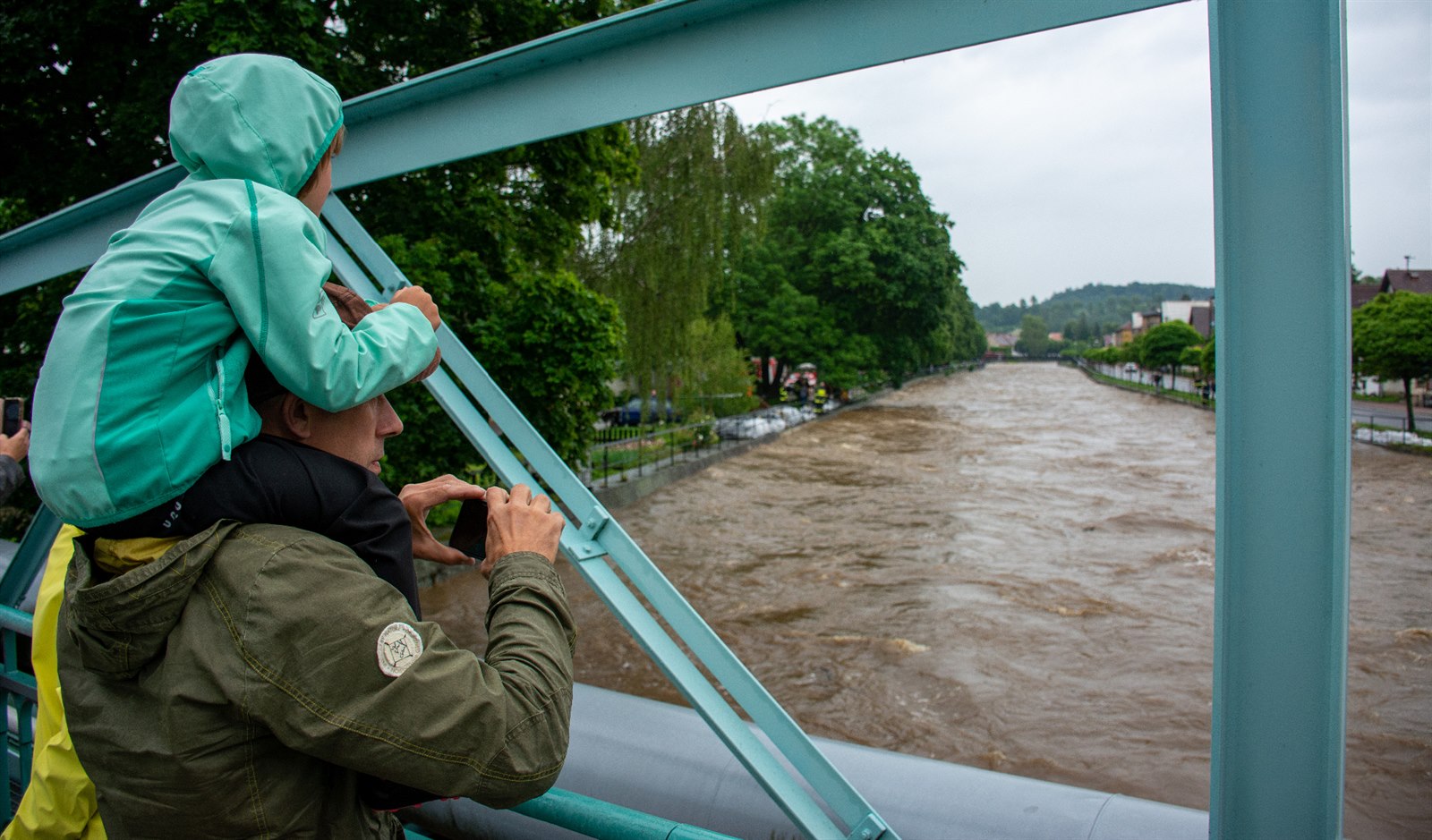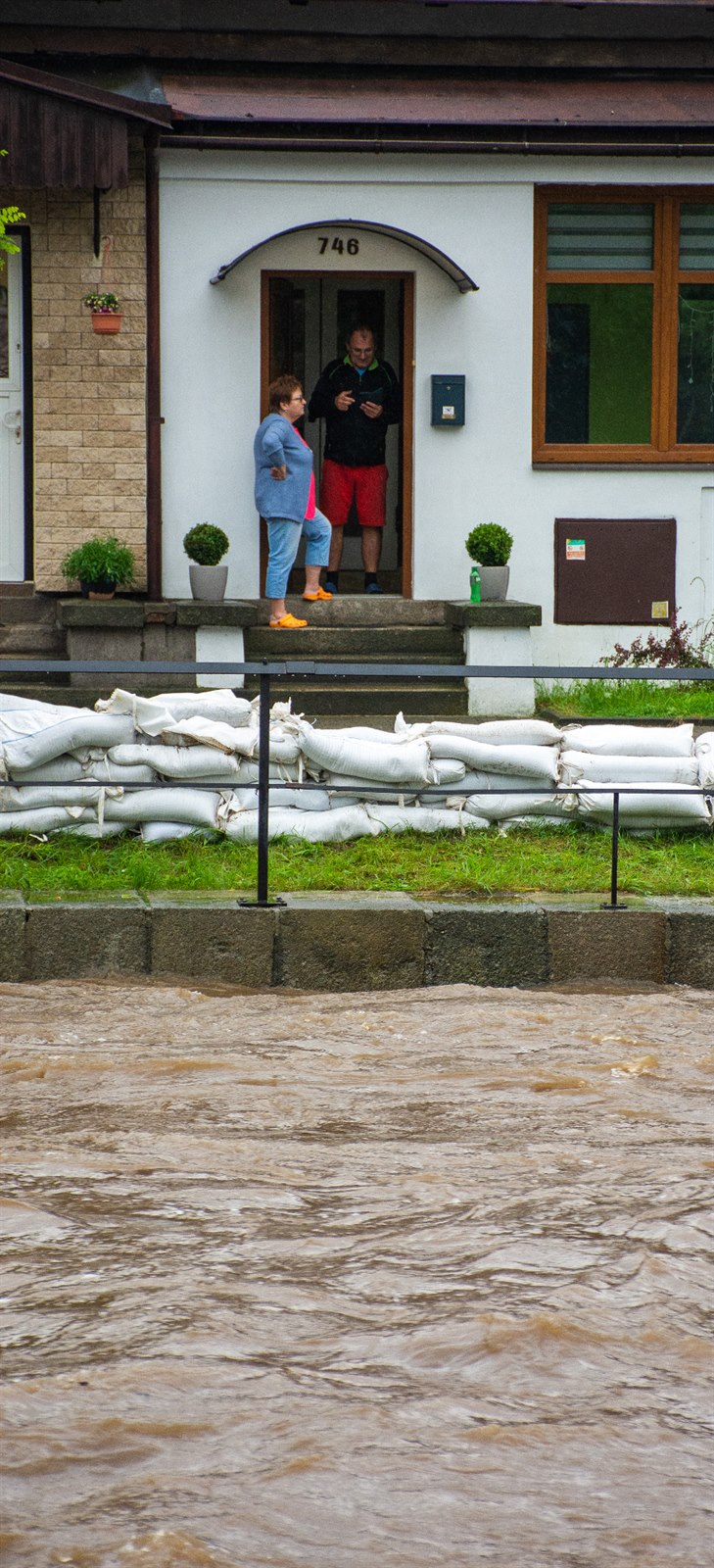 Lidé si fotografují stoupající vodu ve Frýdlantu.