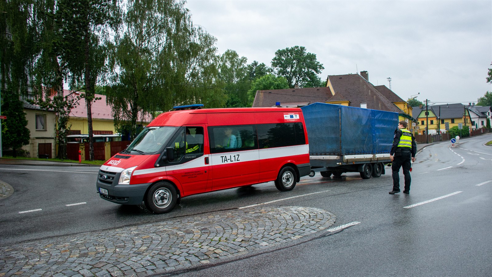 Povodeň spustila vlnu solidarity. Na snímku prodavačka z obchodu nese zmoklým a promrzlým hasičům horkou kávu.
