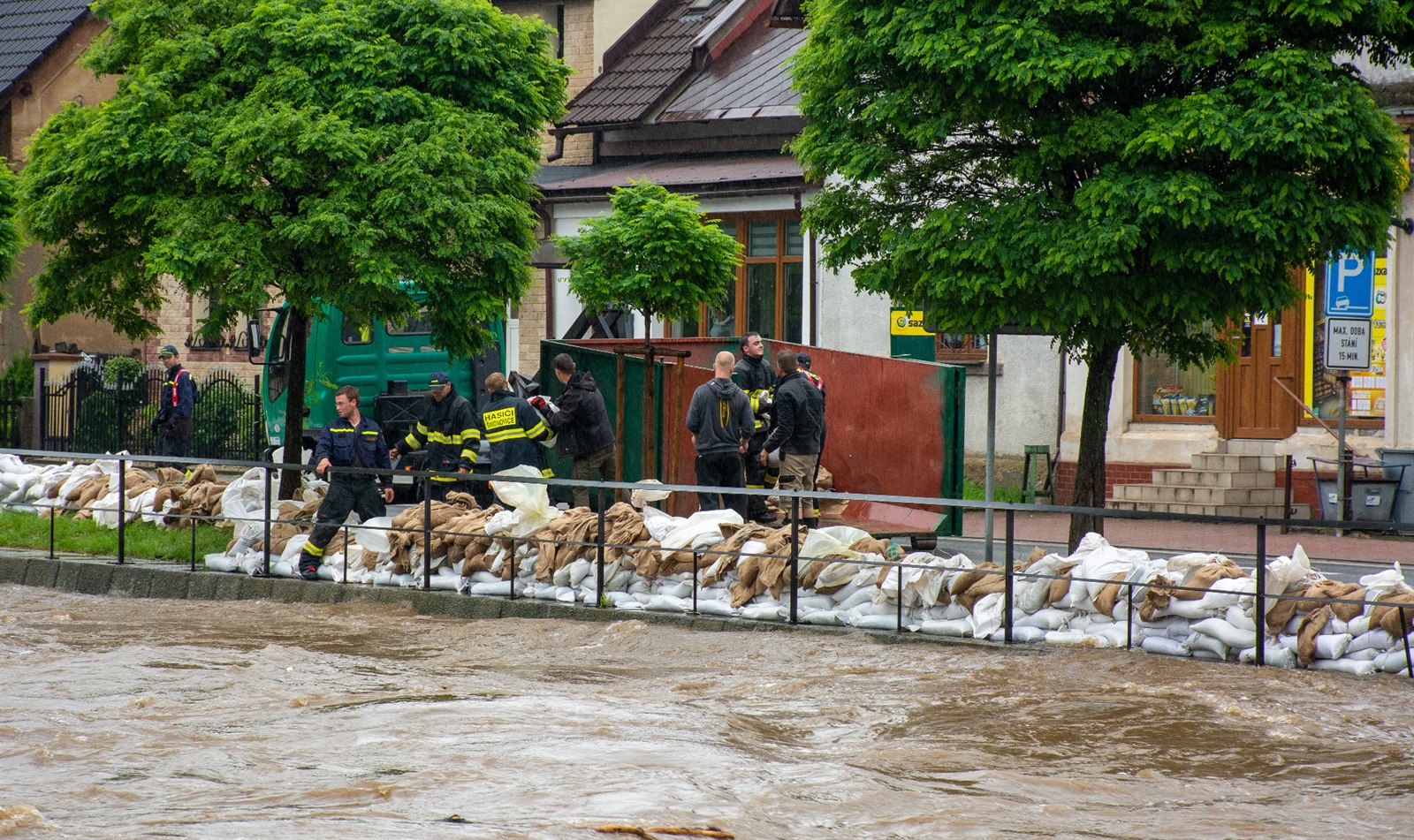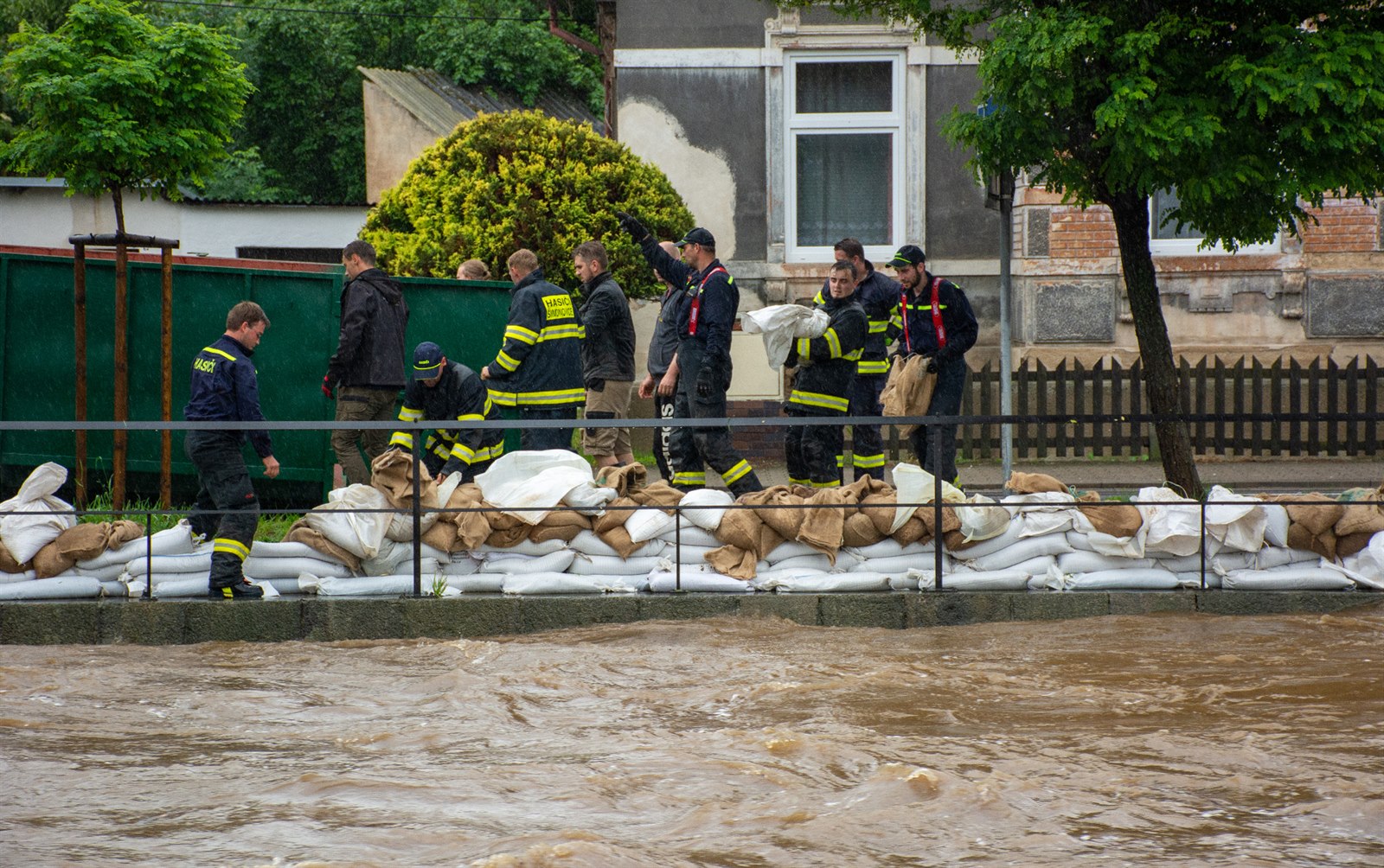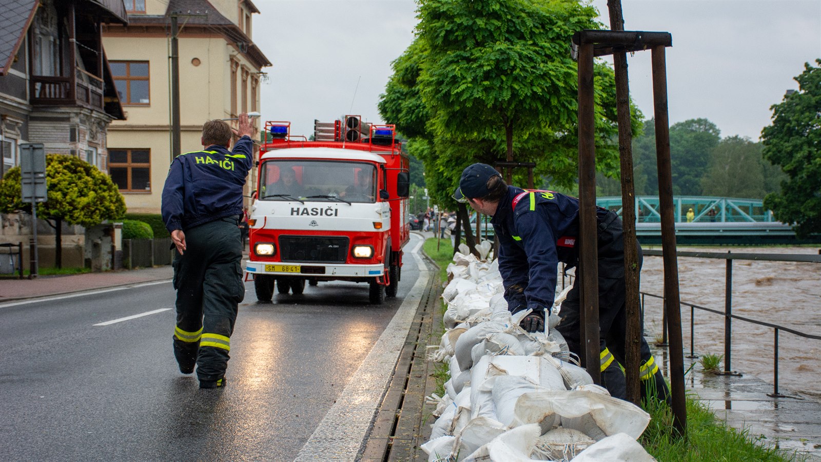 Hasiči po celé odpoledne stavěli bariéry z pytlů s pískem kolem Smědé.