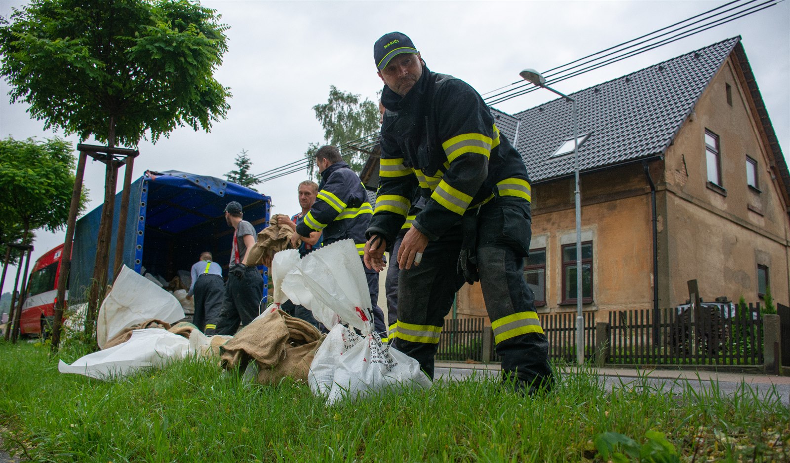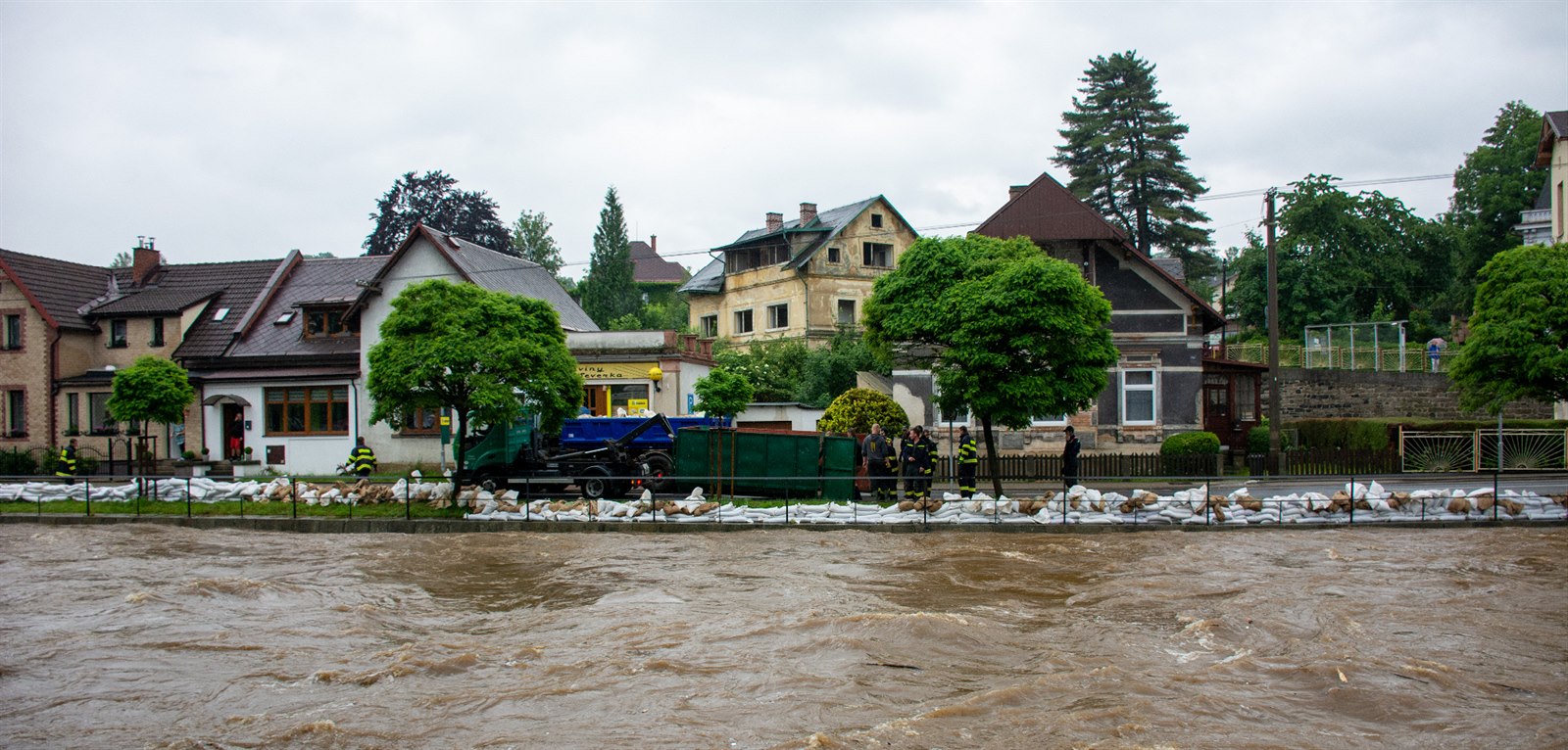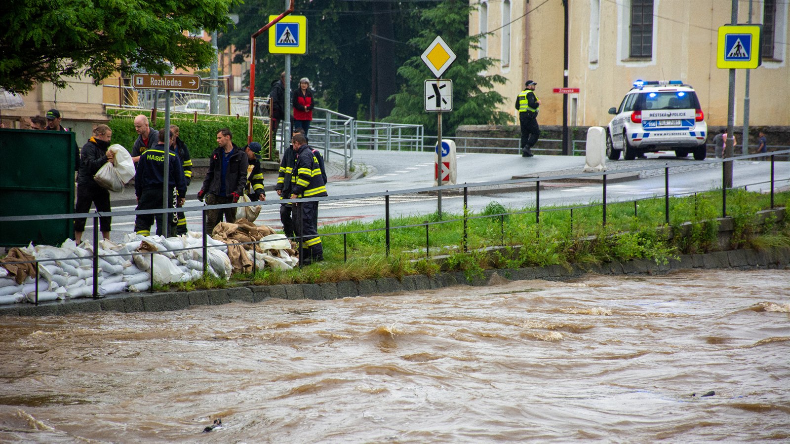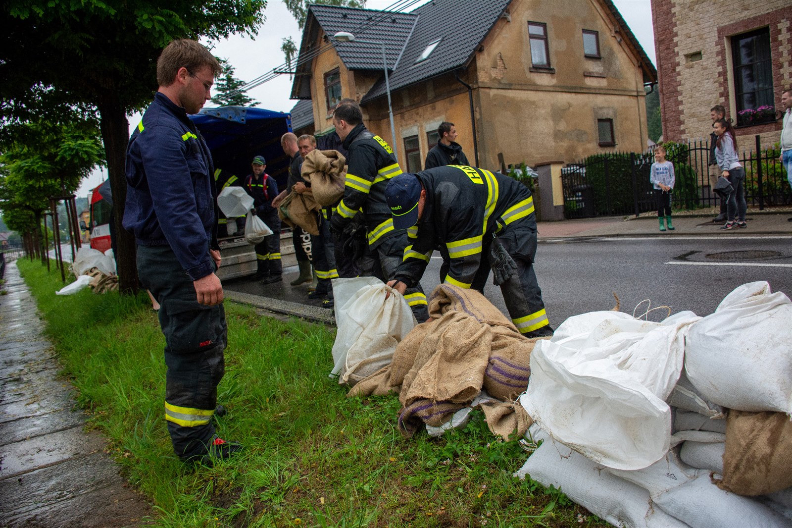 Hasiči po celé odpoledne stavěli bariéry z pytlů s pískem kolem Smědé.