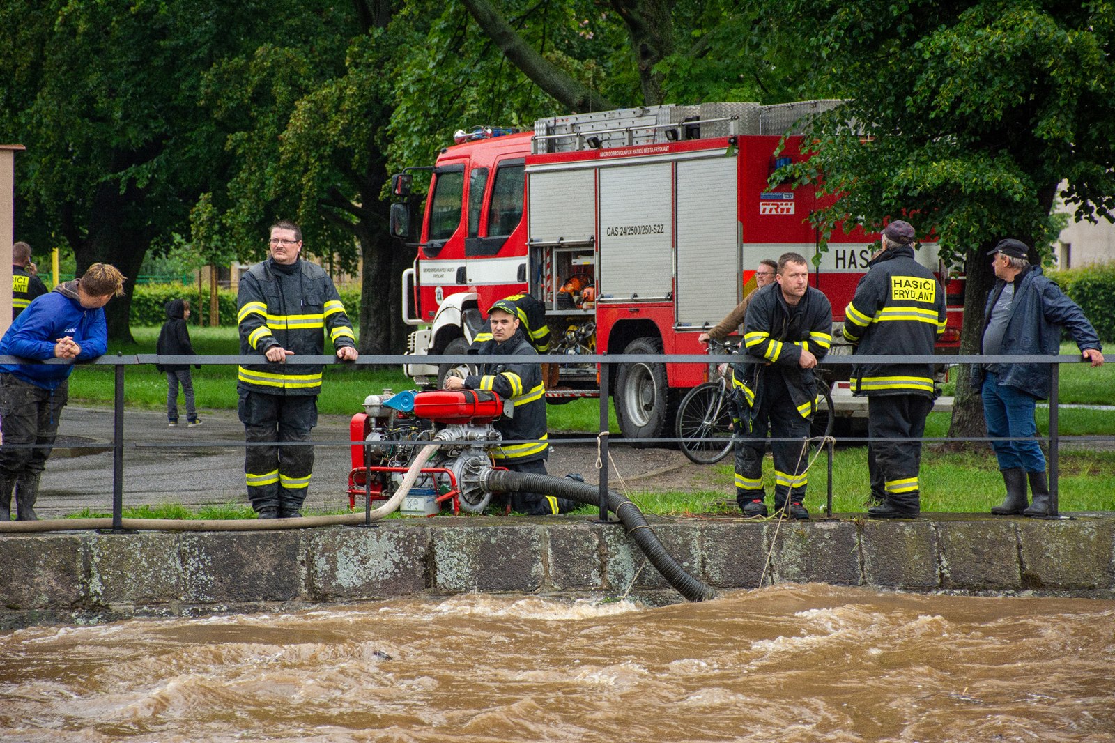 Hasiči čerpají vodu do napouštěcích vaků, které se používají jako bariéry.