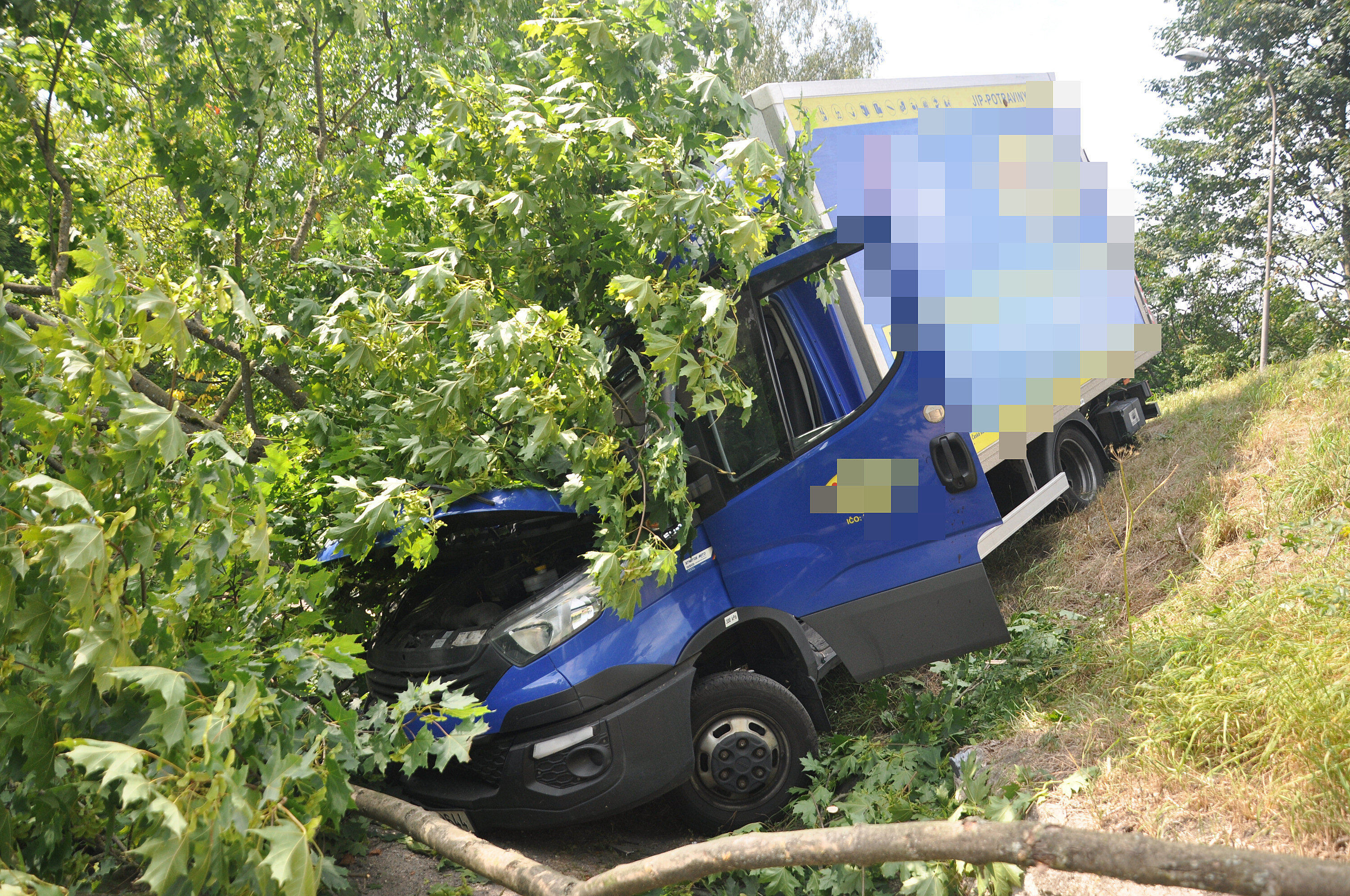 Dodávka pak zůstala na svahu zaklíněná o přelomený strom.
