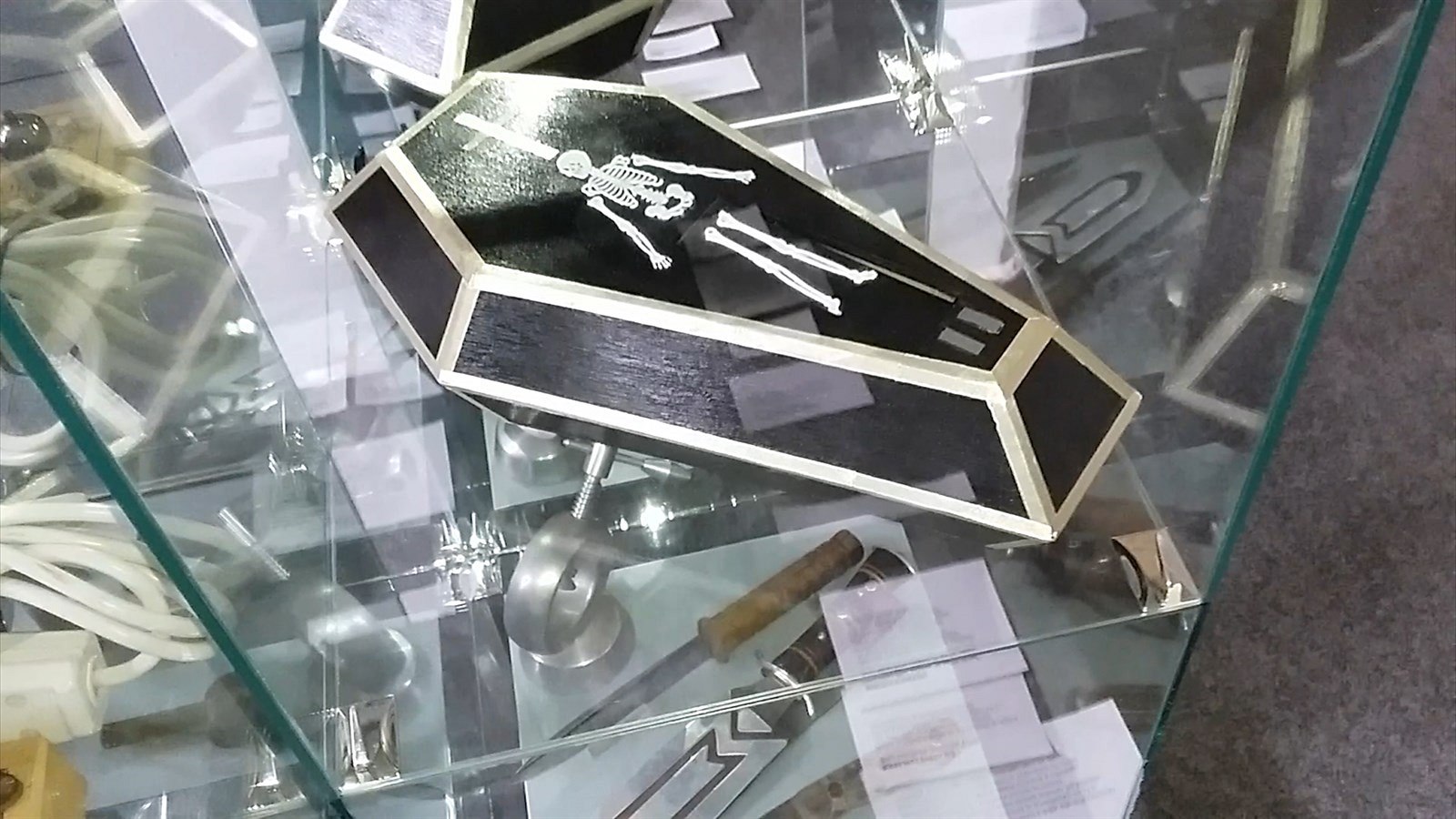 Pro pobavení sloužilo zařízení na kradení mincí. „Prodávalo se jako hračka na poutích, vyjíždí z toho taková ručička,“ uvedl Hrabák. Na výstavě má hračka morbidní podobu malé černé rakve s kostlivcem na víku.
