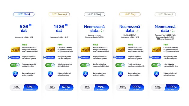 Například základní neomezený tarif, tedy ten s přídomkem Modrý, podražil o 30 korun. Zatímco Neo Modrý vyšel standardně na 599 korun, tak v případě Neo+ Modrý se už zákazník pod šest set korun měsíčně nedostane. Nicméně za svých 629 Kč má k dispozici 6 GB dat, doposud to byly 4 GB. Kromě toho získá již výše zmíněné slevové poukázky, a to v celkové výši až 7 000 Kč (hodnota platná pro všechny tarify Neo+). Použít je může na nákup nového 5G smartphonu (k dispozici dva kupony, každý v hodnotě až 2 000 Kč) či O2 Connect zařízení (k dispozici tři kupony, každý v hodnotě až 1 000 Kč).