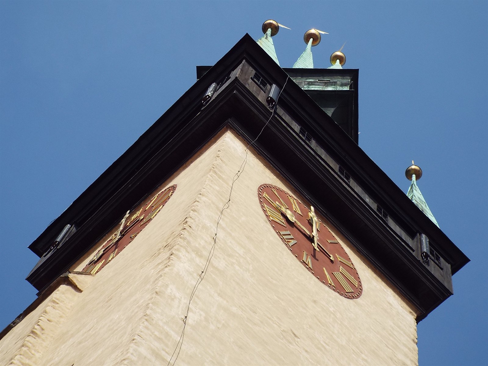 Nacházejí se na věži místního kostela Povýšení svatého Kříže, s níž jsou barevně sladěné.