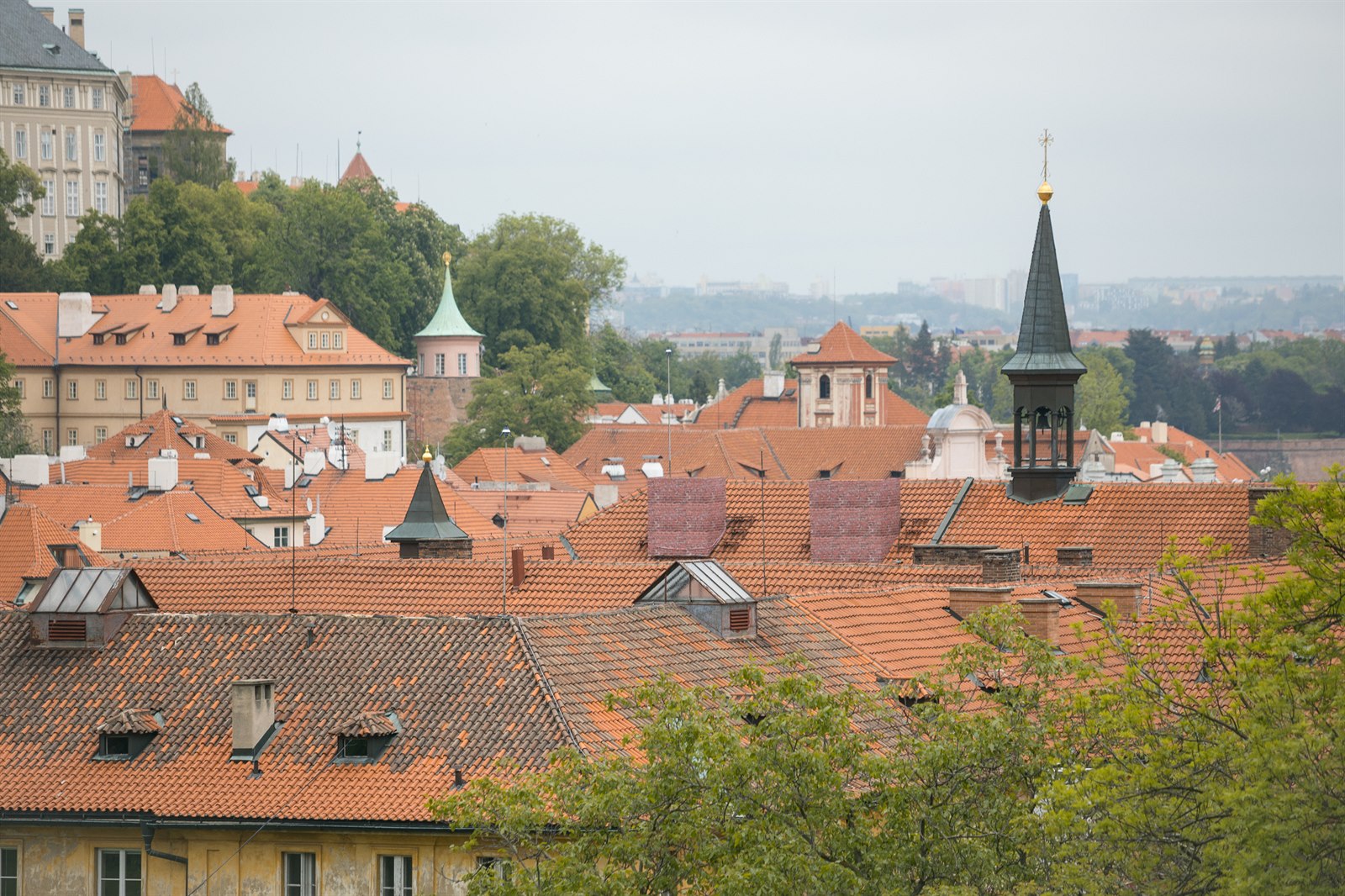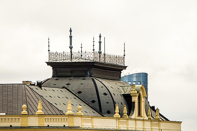 To na střeše jednoho z domů na pražském Senovážném náměstí zaujmou naopak dva kovové kříže. Ani v tomto případě nejde o původní součást střechy.