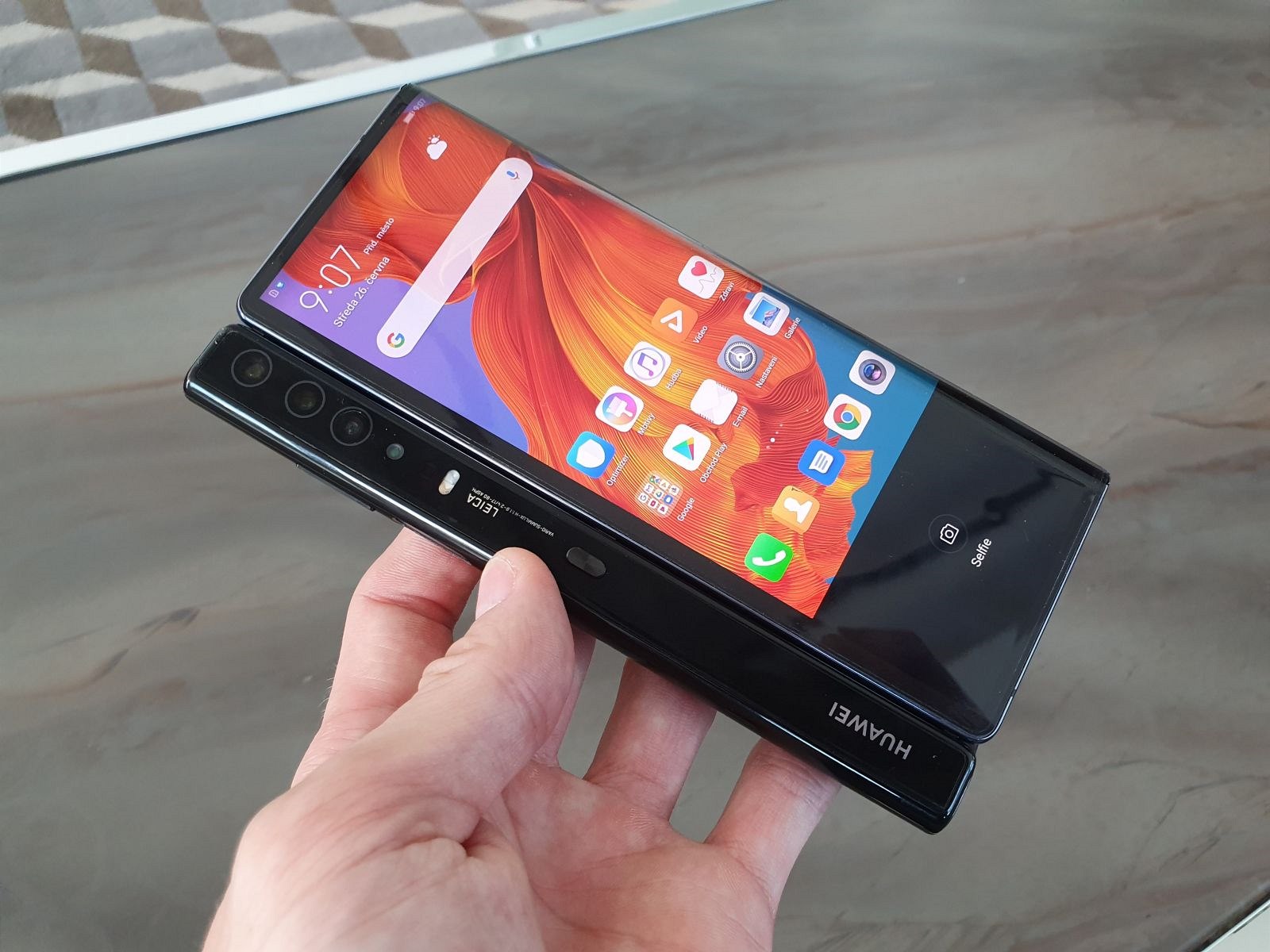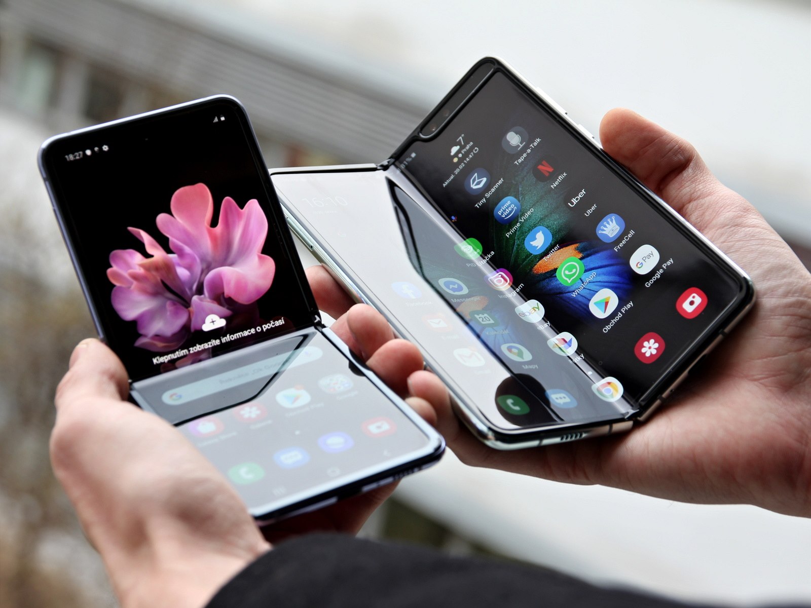 Přesně naopak to krátce na to zkusil výrobce Huawei, který odhalil model Mate X. Ten naopak ohebným displejem pokrývá vnější část zařízení.