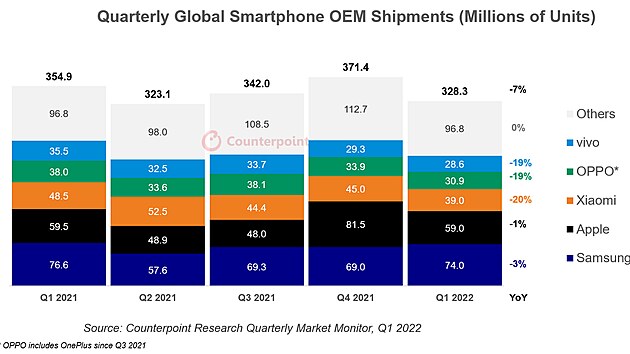Apple byl meziročně zhruba na nule – prodal stejně iPhonů jako před rokem. Mezičtvrtletně byl pokles výrazný, ale to je u Applu obvyklé, jeho nejsilnějším obdobím je konec roku a takové prodeje tradičně v prvním čtvrtletí nedokáže udržet. Analytici uvádí, že nové řadě iPhone 13 se daří výborně a vcelku úspěšný je i nový model SE s podporou 5G. Což je spolu s novým čipem jediná zásadní inovace.