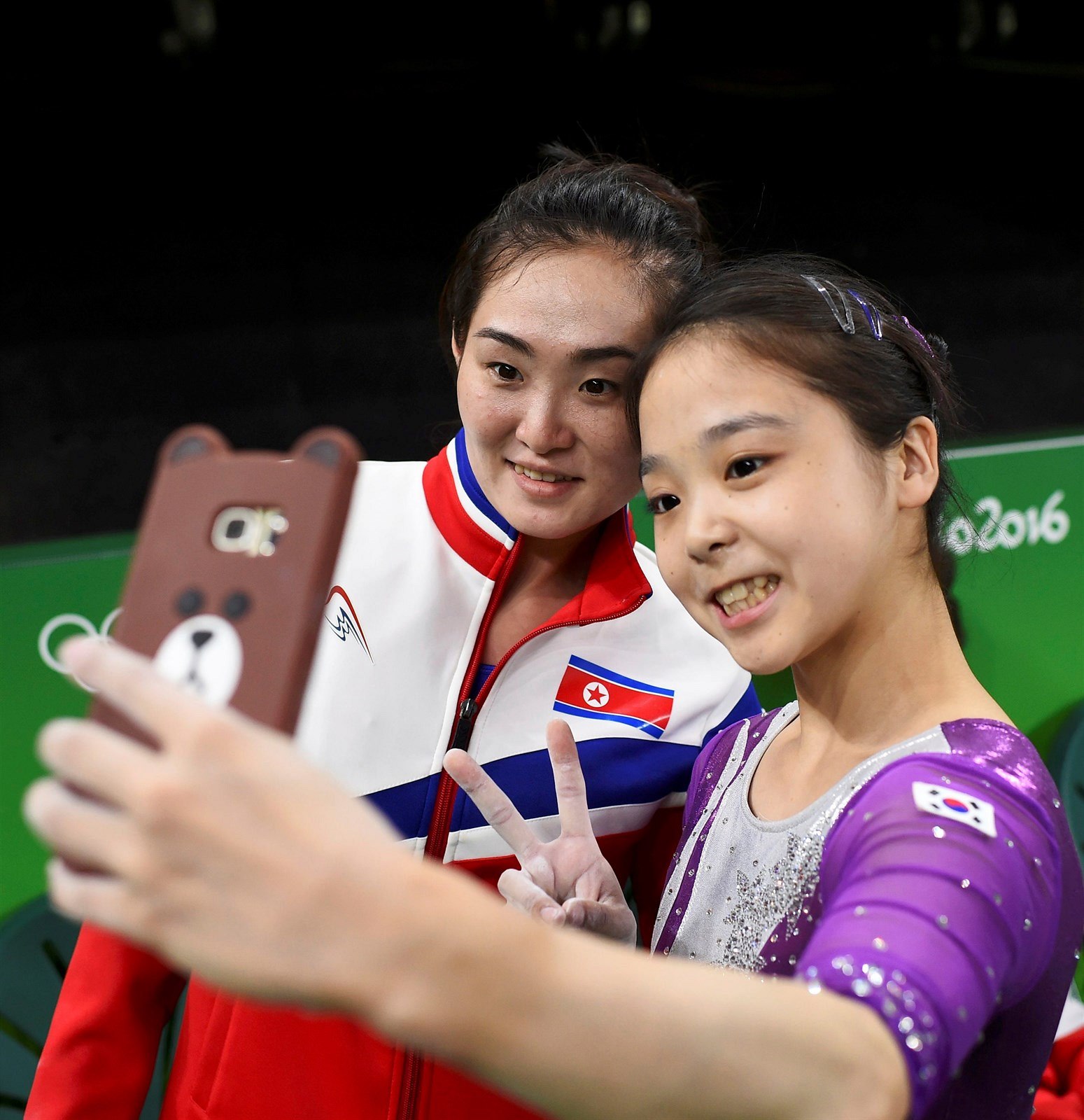 SELFIE NEPŘÁTEL. Jihokorejská gymnastka Lee Jeun-ču se fotí společně se svou soupeřkou Hong Jon Čong ze Severní Koreji, ačkoli na Korejském poloostrově panují velmi nepřátelské vztahy.