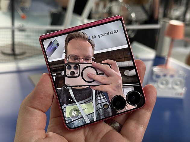 Samsung volí véčka zřejmě právě pro možnost snadného pořizování selfíček. Telefon není třeba otvírat, okolo objektivů hlavního foťáku je velký displej, takže není potřeba pro selfie používat slabší foťáček u hlavního displeje.