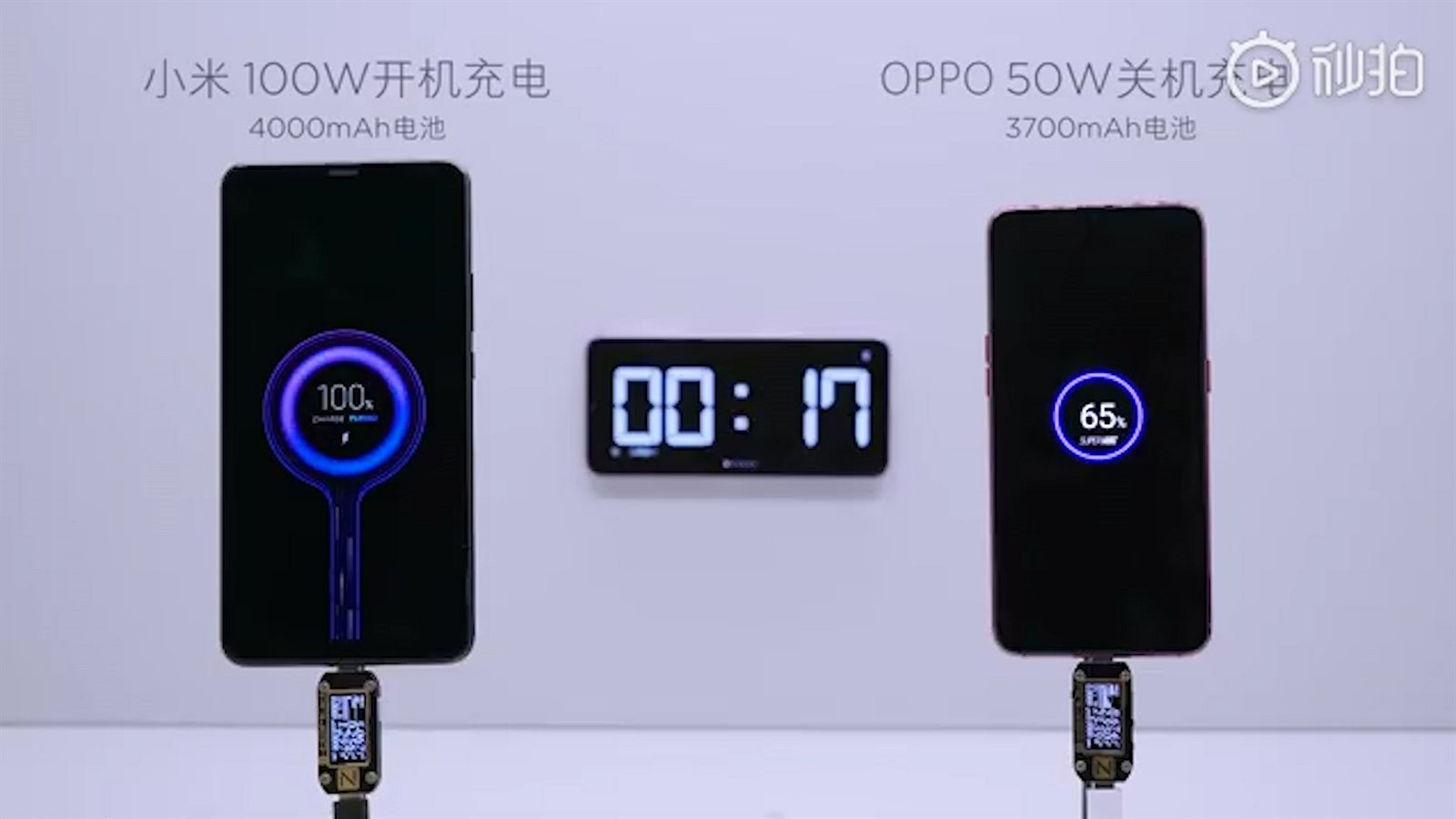 Ve videu porovnává nespecifikovaný model s 4 000mAh baterií proti modelu od Oppa s 3 700 mAh akumulátorem. Xiaomi má nabito na sto procent za těžko uvěřitelných sedmnáct minut, zatímco konkurenční Oppo se za tu dobu vyšplhalo jen na pětašedesát procent.