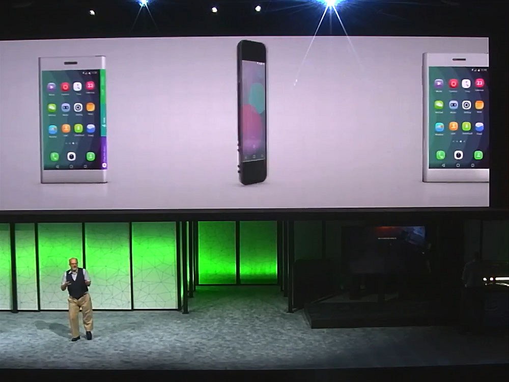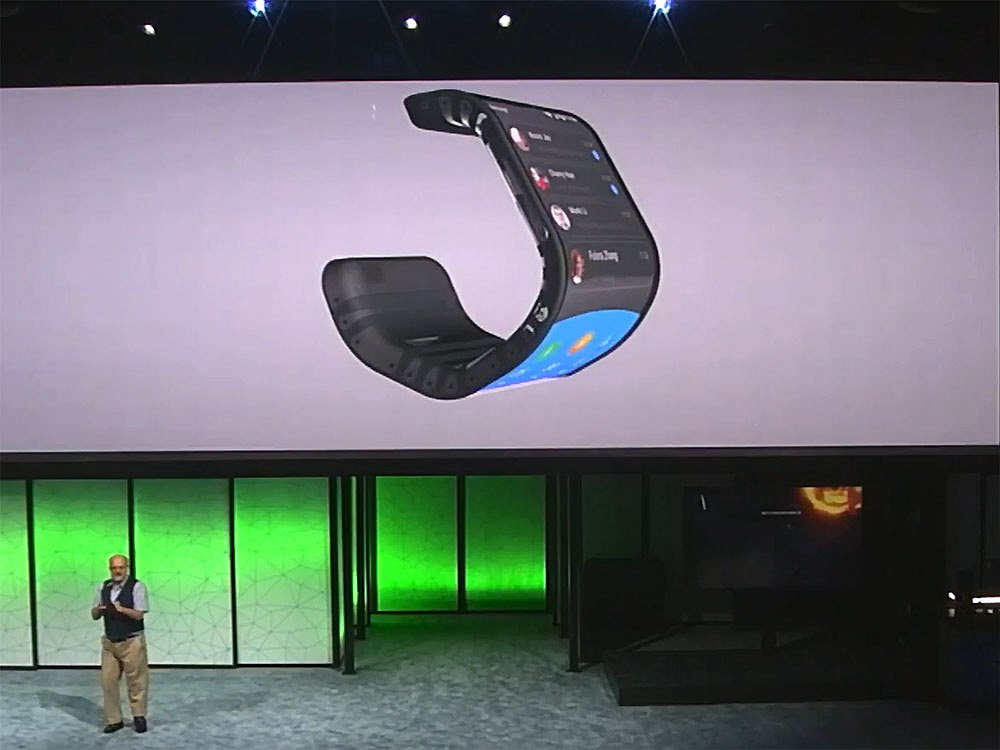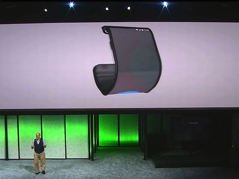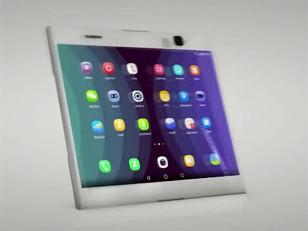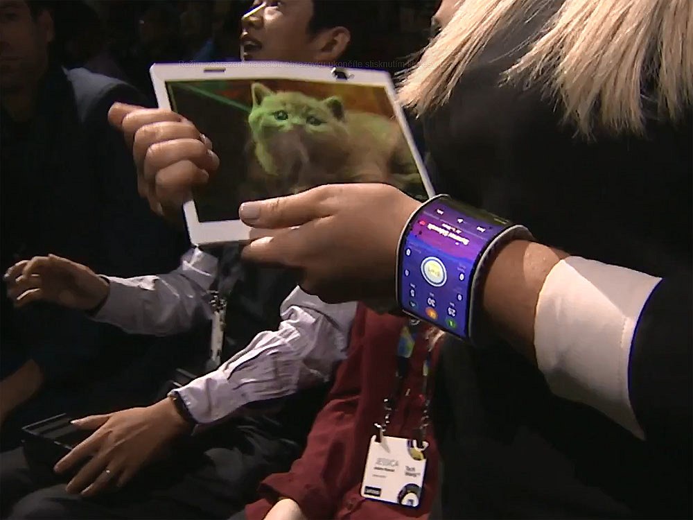 Na displeji byla statická fotografie kočky, při záběru kamer pak displej působil jako volná fólie, která se vlní. V principu ale půjde o přístroj, který se z velikosti tabletu přeložením na půlku změní na větší smartphone, z kterého půjde telefonovat.