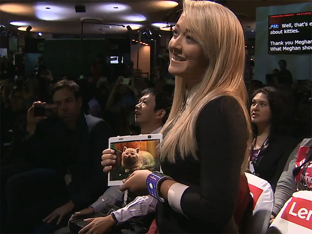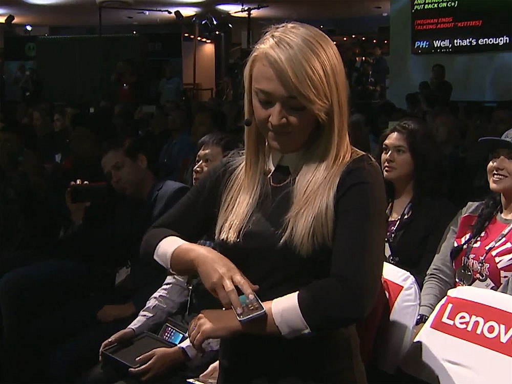 Ohýbací smartphone, který se dá ohnout a navléct na zápěstí, představila youtuberka a scenáristka animovaných filmů Meghan McCarthyová. Svým poněkud zvláštním hlasem pochválila své šaty, které ale nemají žádnou kapsu. Což byla příležitost pro ohýbací smartphone Lenovo Cplus, který kapsu nepotřebuje.