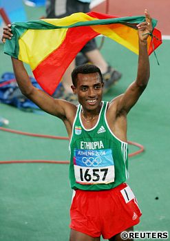 Kenenisa Bekele slaví s etiopskou vlajkou nad hlavou zlatou olympijskou medaili v běhu na 10 000 m. |