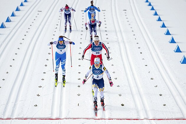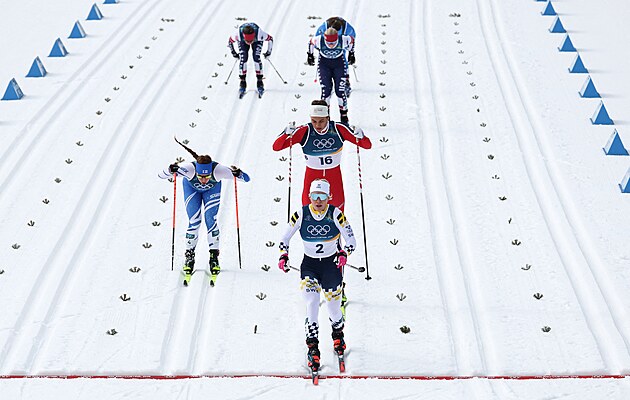 Jonna Sundlingová ze Švédska před cílovou čáru ve čtvrtfinále sprintu žen v klasice. (10. února 2026)