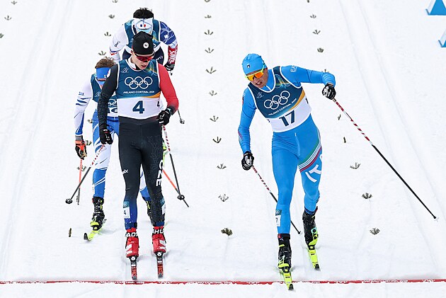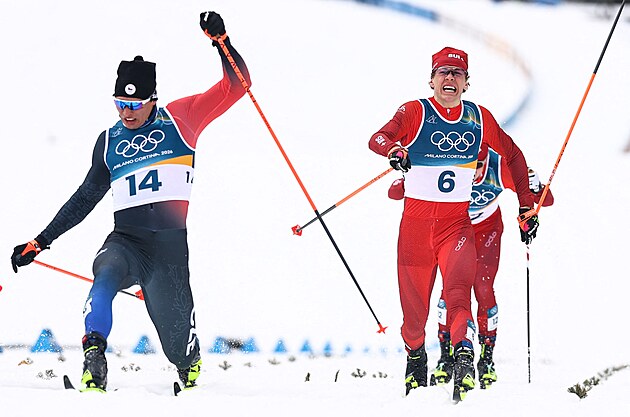 Jiří Tuž (vlevo) a Simone Mocellini z Itálie překračují cílovou čáru během čtvrtfinále sprintu klasicky mužů. (10. února 2026)
