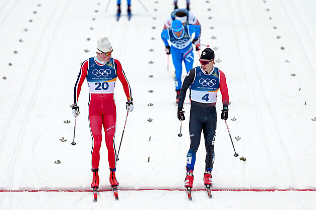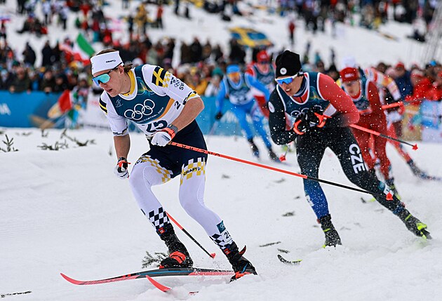 Anton Grahn ze Švédska a Ondřej Černý z České republiky v akci během čtvrtfinále sprintu klasicky. (10. února 2026)