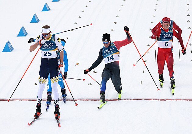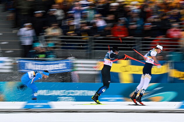 Anton Grahn ze Švédska, Ondřej Černý z České republiky a Noe Naeff ze Švýcarska překračují cílovou čáru během čtvrtfinále sprintu klasicky. (10. února 2026)