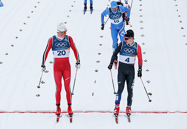 Ben Ogden ze Spojených států a Emil Liekari z Finska v akci během čtvrtfinále. (10. února 2026)