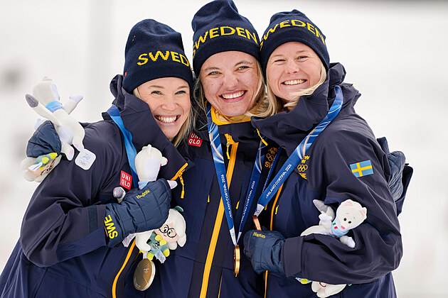 Švédky (zleva) stříbrná Jonna Sundlingová, zlatá Linn Svahnová a bronzová Maja Dahlqvistová se radují ze svých medailí ze sprintu klasickou technikou.