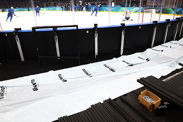 Dodělávky i během tréninku. Takhle to vypadalo kolem mantinelů před prvními zápasy ženských hokejových týmů.