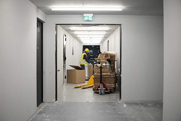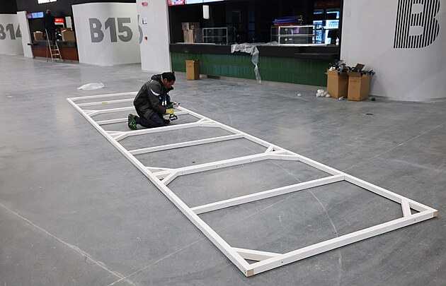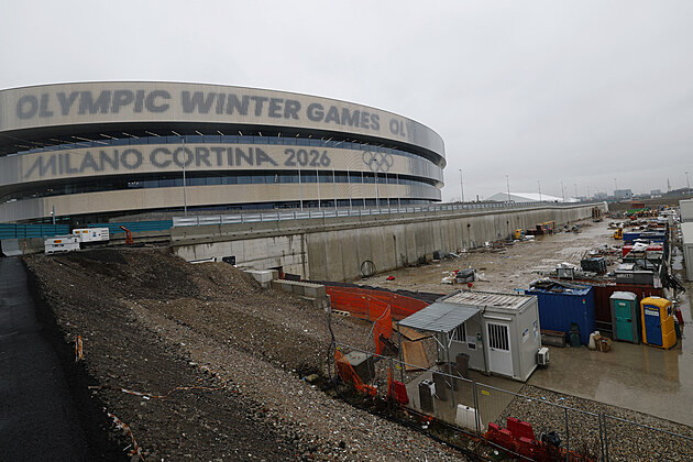Kudy kam? Mezi palety a doleva. Práce na hokejové areně v Miláně definitivně skončí až s prvními ostrými olympijskými zápasy.