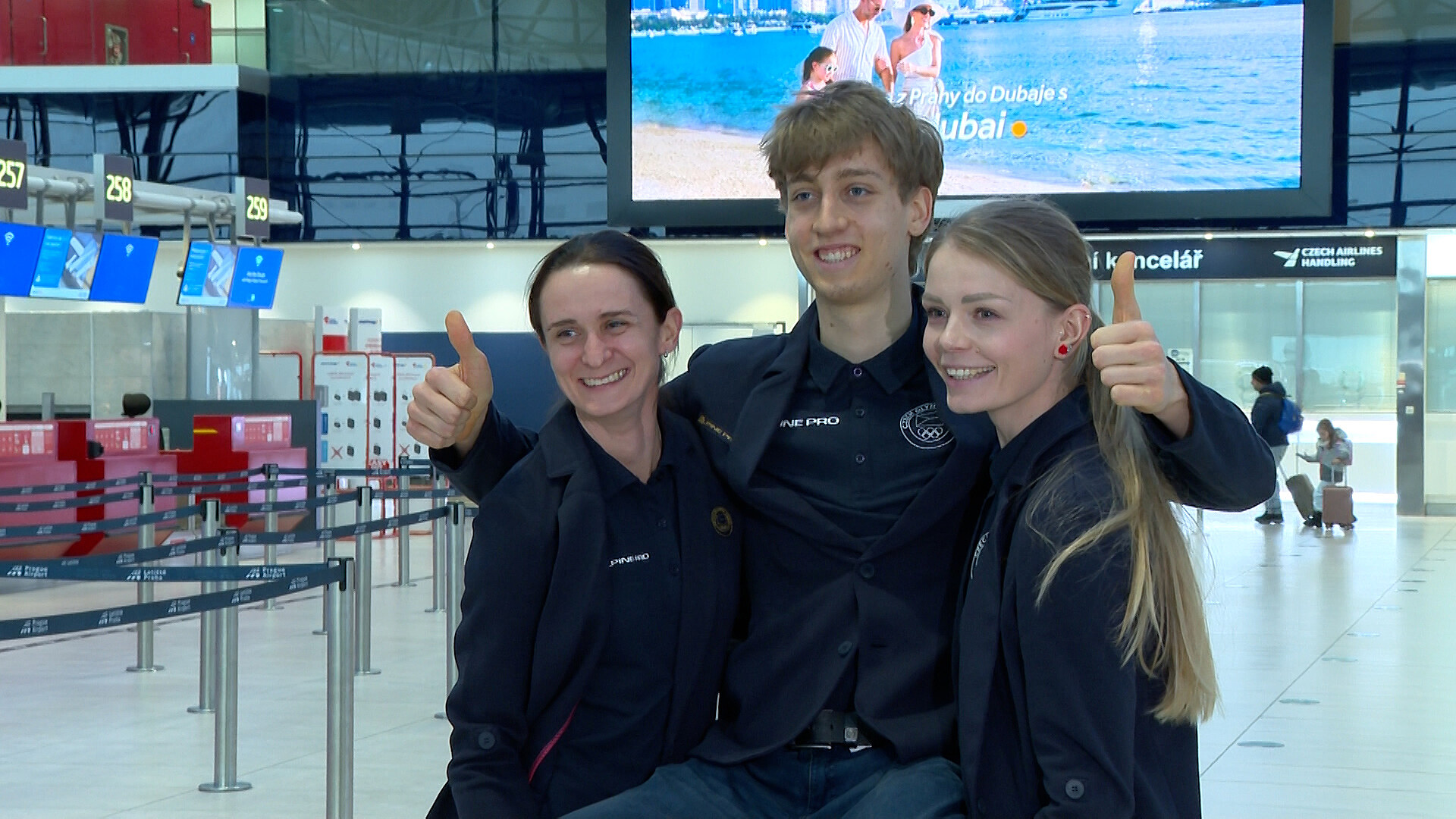Než se vypraví na kontrolu a ke svému gatu, ještě všichni tři podepisují kartičky se svými fotkami. Nejzkušenější členka při rozhovoru působí uvolněně a párkrát se i dojme.