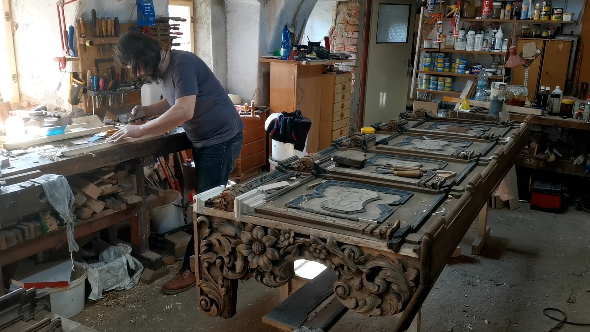 „Prvním krokem je vždy očištění, pak většinou musíme zpevnit konstrukci a následuje doplnění chybějících částí. Drobnosti tmelíme, ale jinak vše vysazujeme dřevem. Chybí tam spousta lišt, v bohaté řezbě je mnoho částí odlomených,“ řekl.