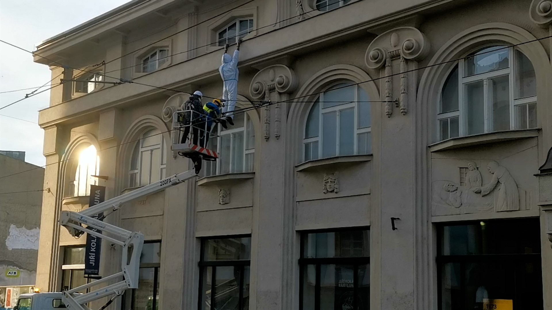 Pachatel ručkuje po římse budovy osm metrů nad zemí a nadává, protože se nemůže dostat dolů. Za zmínku stojí, že hlas mu propůjčil zpěvák David Koller.