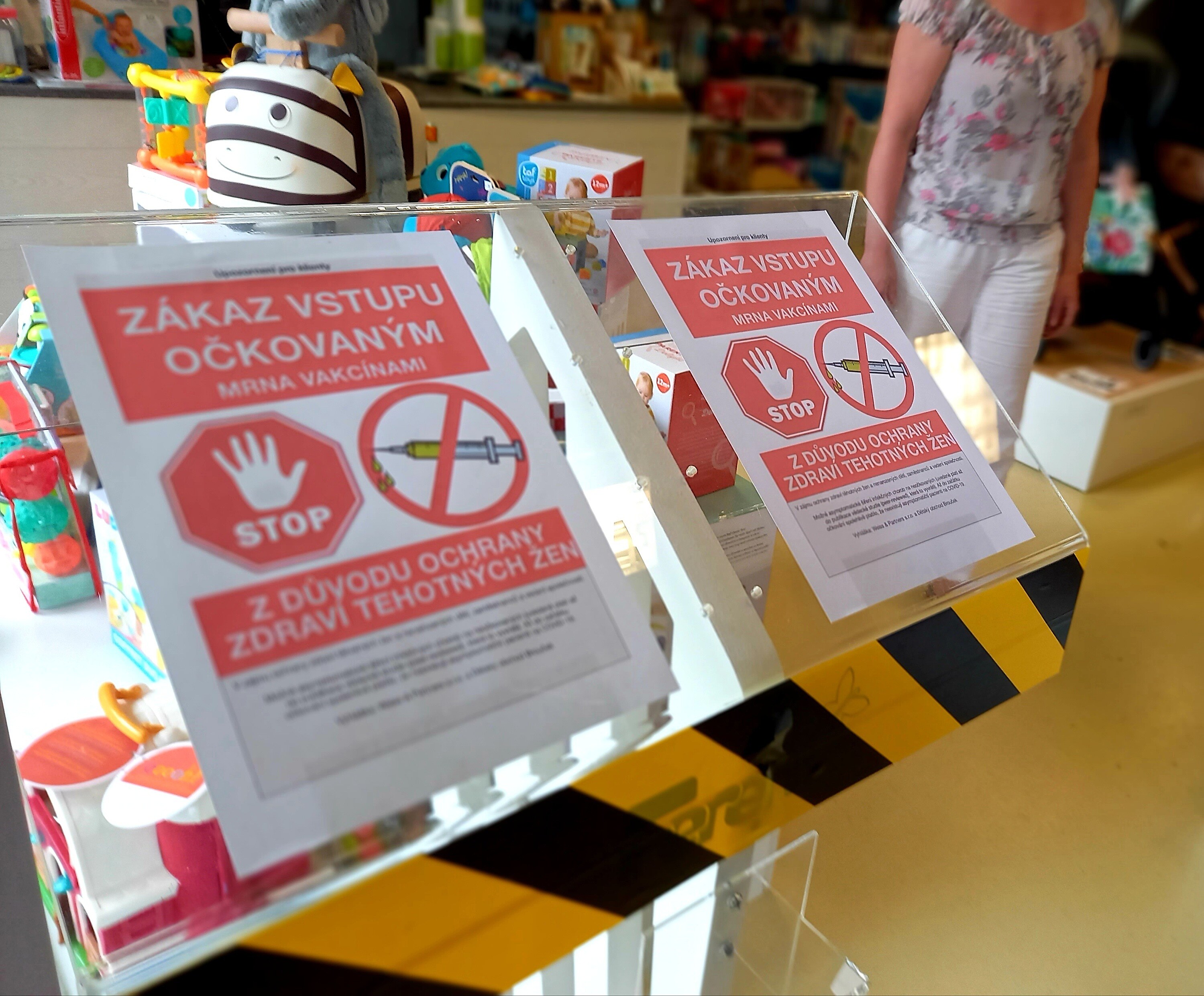 Dvě cedule s nápisem „Zákaz vstupu očkovaným mRNA vakcínami“ a obrázkem, na kterém jsou značky s nápisem STOP a přeškrtnutou injekční stříkačkou, jsou na stojanu u vchodu do prodejny.