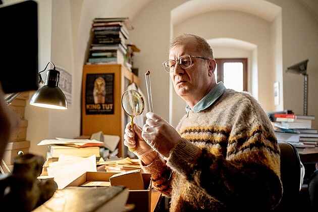 Martin Pechlát coby plachý vědec Čenda ve svém kabinetu, který mu filmaři zřídili v univerzitním Konviktu.