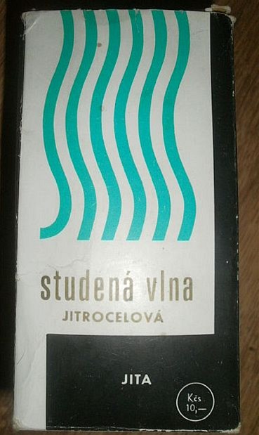 A jak vypadaly kosmetické prostředky, jejichž pomocí si ženy a dívky vylepšovaly vzhled? Na snímku například studená vlna Jita, výrobce Hlubna chemické výrobní družstvo Brno