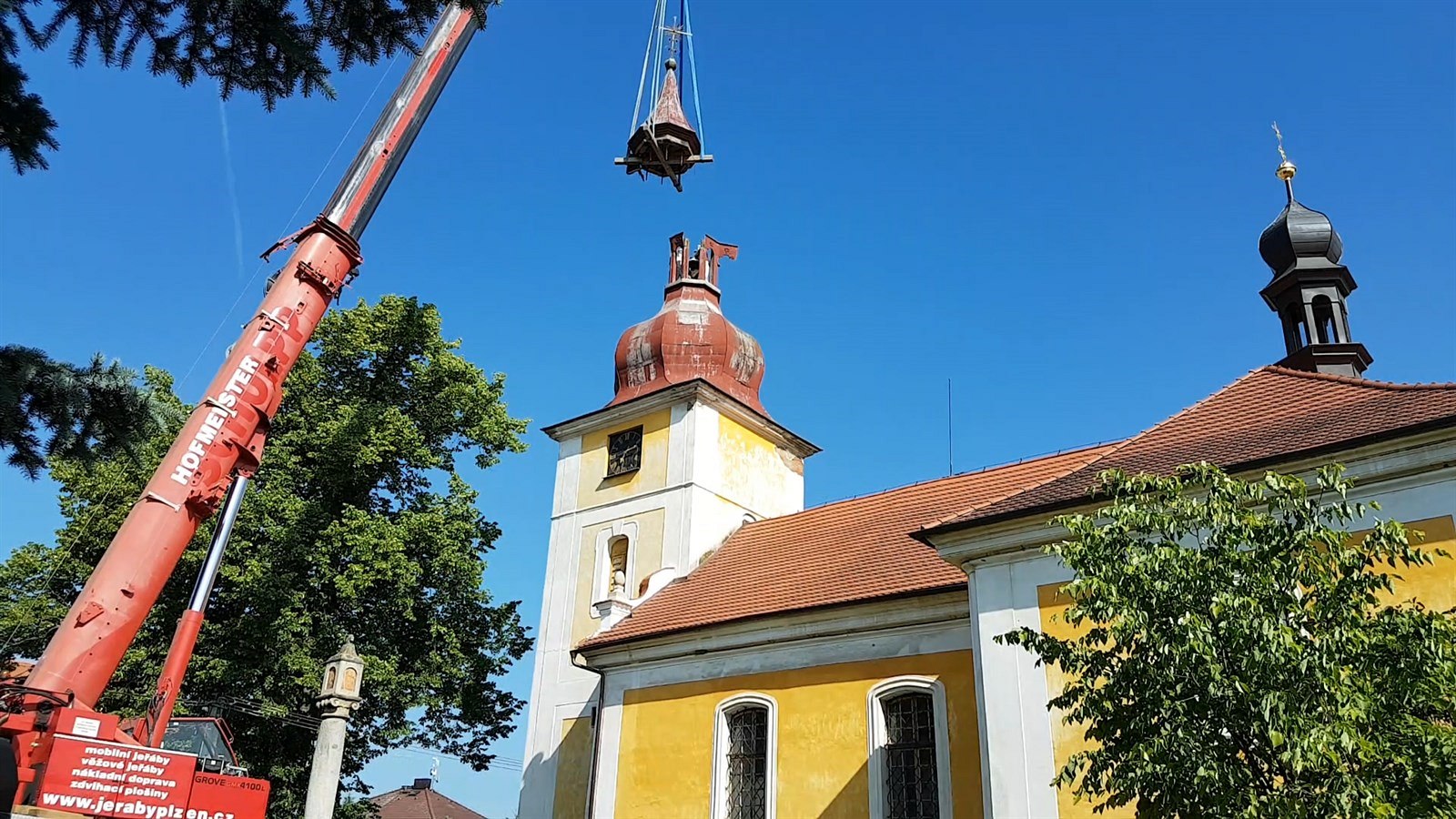 Pak jeřáb snášel trám se dvěma zvony, na jednom byl nápis, že pochází z roku 1695. A nakonec se k zemi ladně snesla velká cibule věžní báně.
