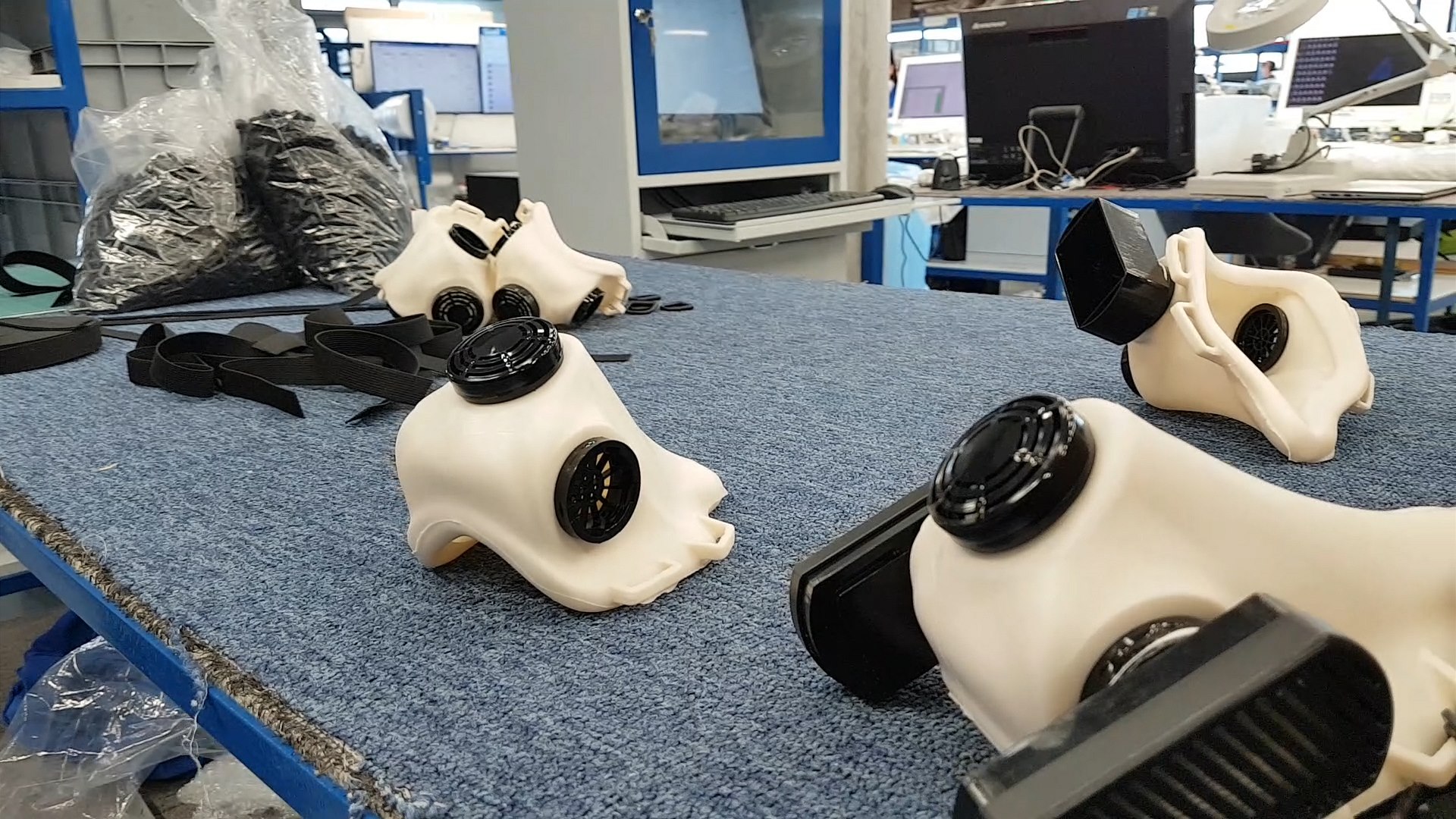 Zaměstnanci v oddělení kompletace do těla masky zakrývající ústa a nos upevňují dva nádechové filtry, jeden výdechový a systém upínání masky na hlavu.