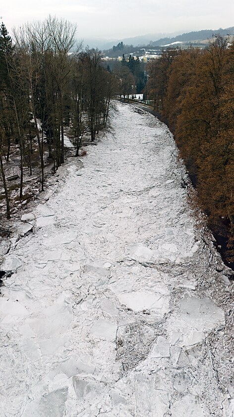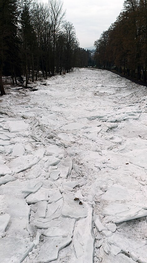 Koryto řeky je plné kusů ledu zejména u ostrova Santos, což je část lesoparku Luh. Některé kry se dostaly i ven na břeh, jsou částečně na cyklostezce. Také voda se rozlila mezi stromy Santosu.