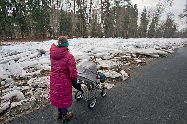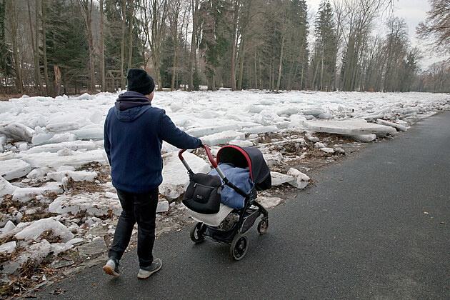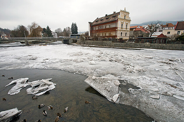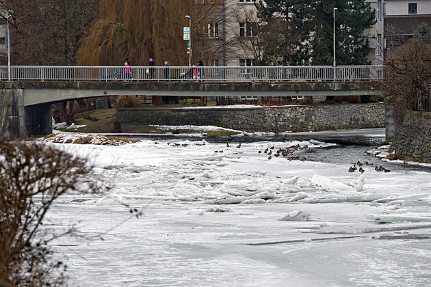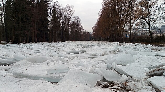 Ledové kry zastavuje na okraji města jez. Zatím nikoho neohrožují. Až se víc oteplí, kry by se měly samy rozpojit a voda je odnese dál po proudu.