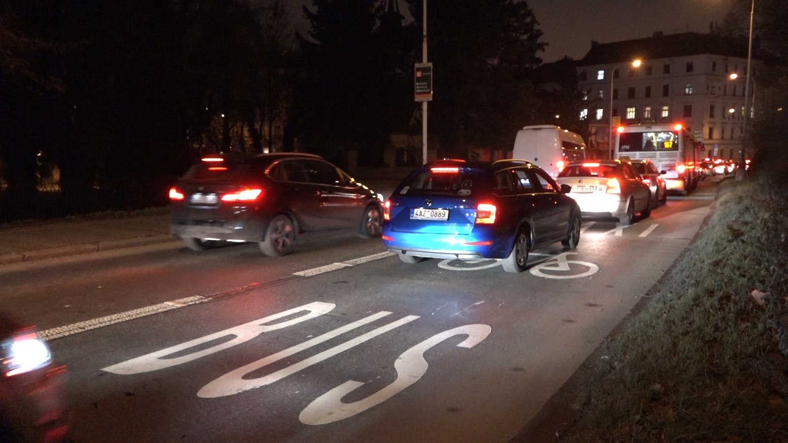 Například na Vrchlického ulici v Praze 5 se autobusy zdrží v ranní a odpolední špičce i deset a více minut. Pruh pro auta i autobusy je kompletně ucpaný osobními vozy.